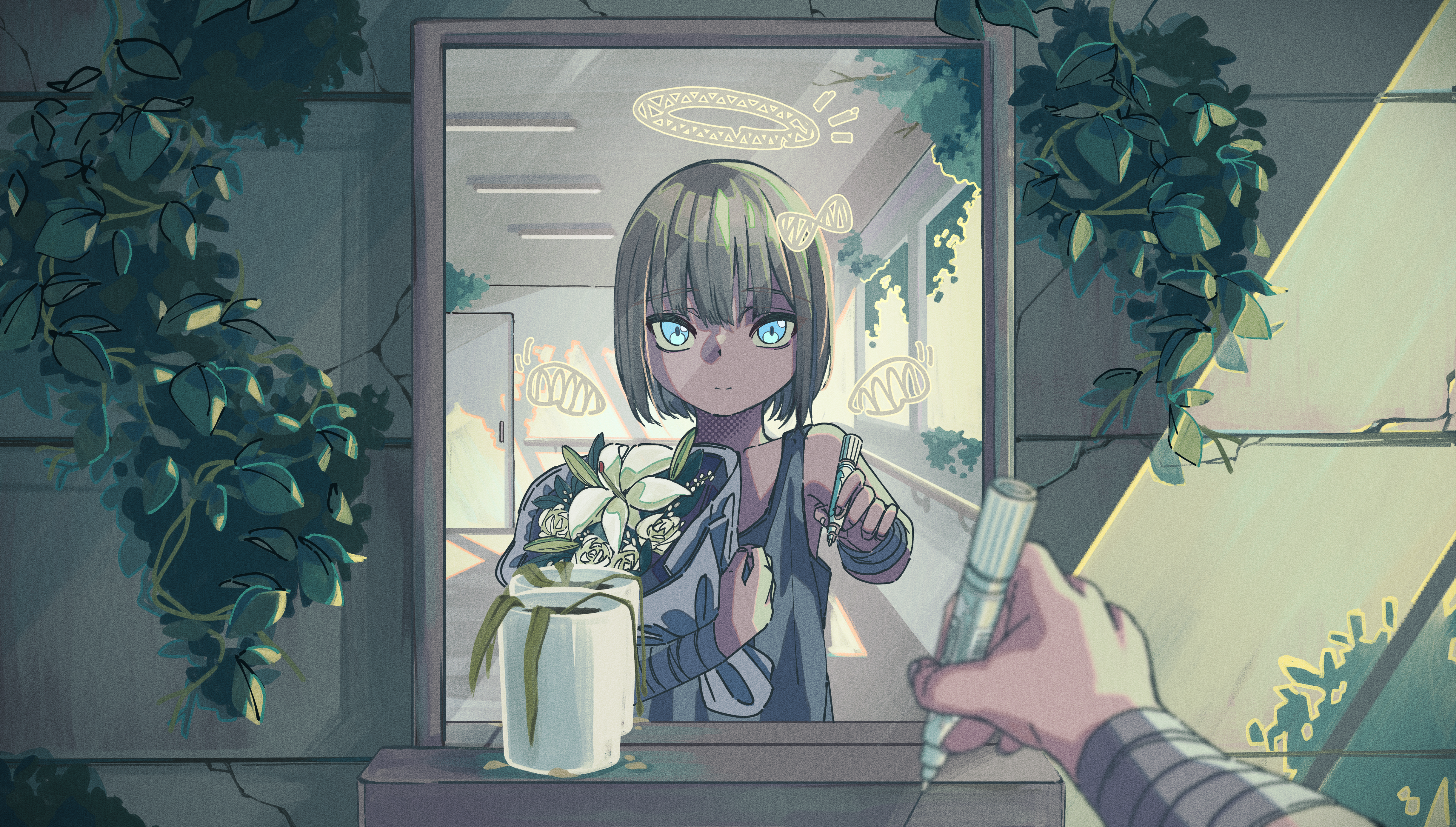 1girlbandaged armbandagesbare shouldersblonde hairblue eyesblurryblurry foregroundbob cutbouquetclosed mouthcollarbonedead plantsdrawn bowdrawn halodrawn wingsflowergrey tank tophalftonehaloholdingholding bouquetholding markerindoorslooking at viewermarkermirrorovergrownplantpotted plantpovpov handsreflectionreflection focusroseshort hairsmilesolosplit mouthtank topupper bodyvineswhite flowerwhite rose