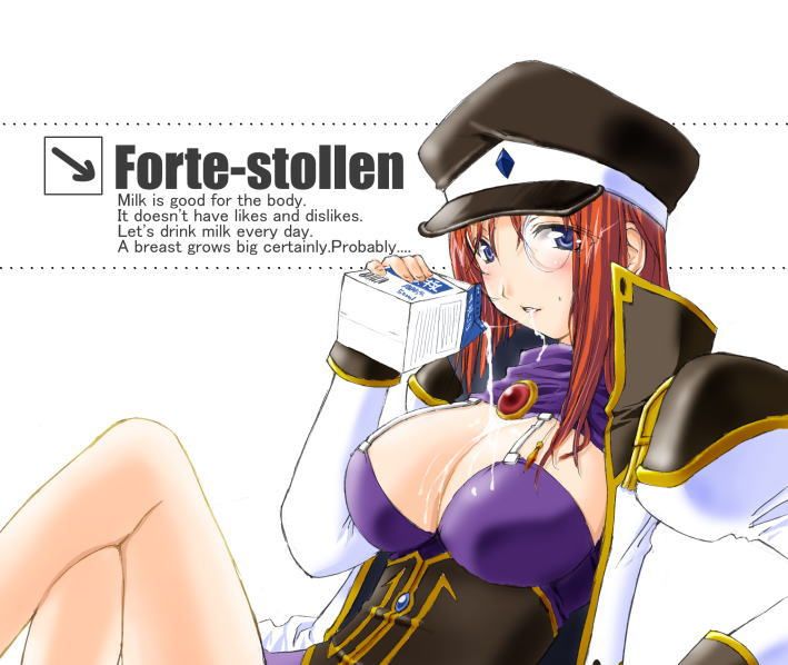 00s1girlblue eyesbreastscharacter namecleavagecleavage cutoutclothing cutoutenglish textengrish textfemale focushatlooking at viewermilitarymilitary uniformmilkmilk cartonmonoclepeaked capranguagered hairshort hairsimple backgroundsolosuggestive fluid