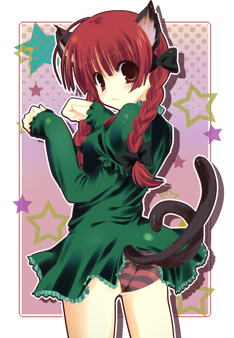 1girlanimal earsblushbraidcat earscat girlcat tailclothes liftdressdress liftfemale focuslifted by taillooking backmultiple tailspantiespaw posered eyesred hairribbonskirtskirt liftsolostriped clothesstriped pantiestailtwin braidstwintailsunderwear