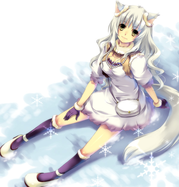 1girlanimal earsarm supportbagbeadsbreastscleavagefemale focusfox earsgloveshandbagkneehighslong hairsittingsmilesnowsnowflakessockssolotailwhite hairyellow eyes
