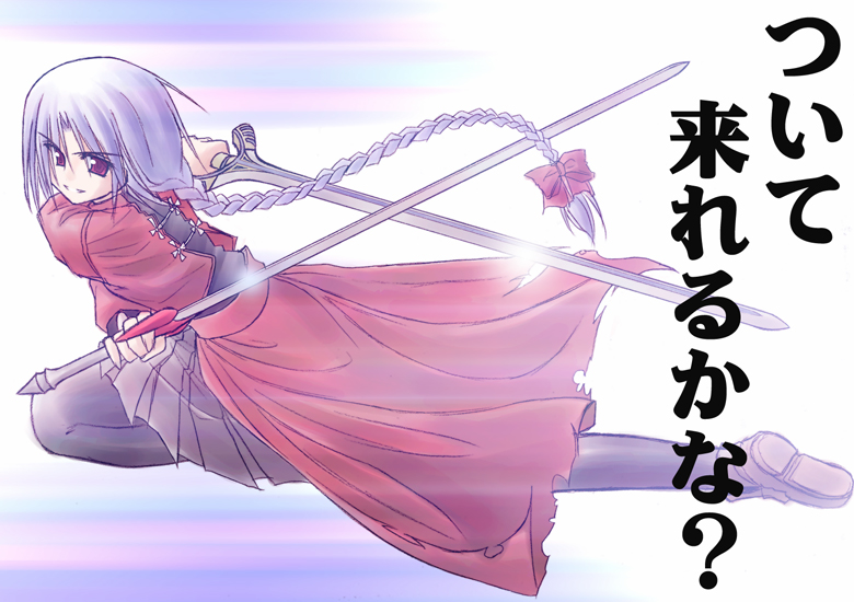 00sbraiddual wieldingholdinglong hairpantyhosered eyesshoesskirtsoloswordthighhighswaist capeweaponwhite hair