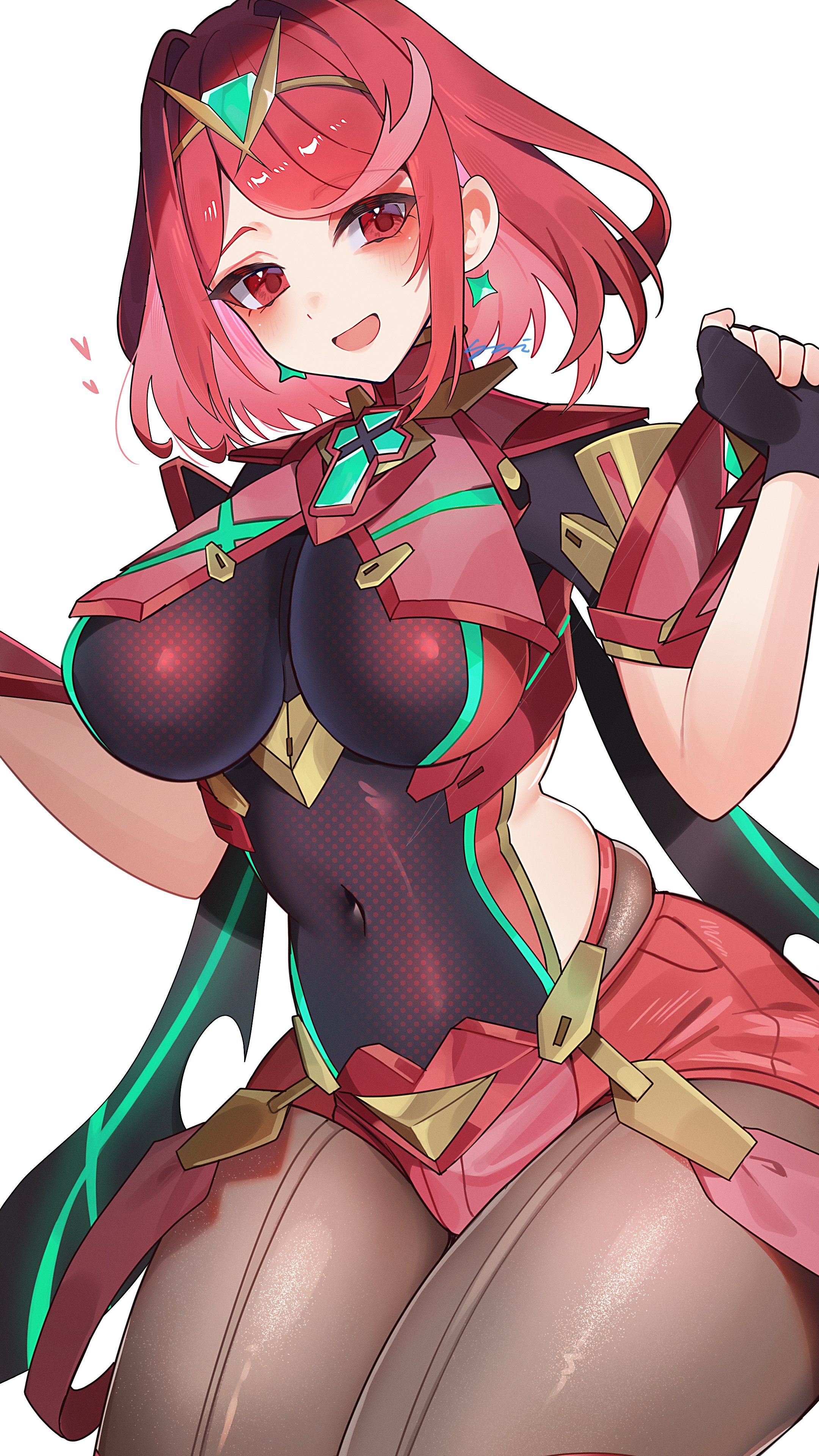 1girlarmorbackless outfitblack glovesbob cutbreastsbrown pantyhosechest jewelcore crystal (xenoblade)earringsfingerless glovesfloating earringsgloveshands upimpossible clothesjewelrylarge breastspantyhosepantyhose under shortsred eyesred hairred shortsshort hairshort sleevesshortsshoulder armorsignaturesmilesoloswept bangstiara