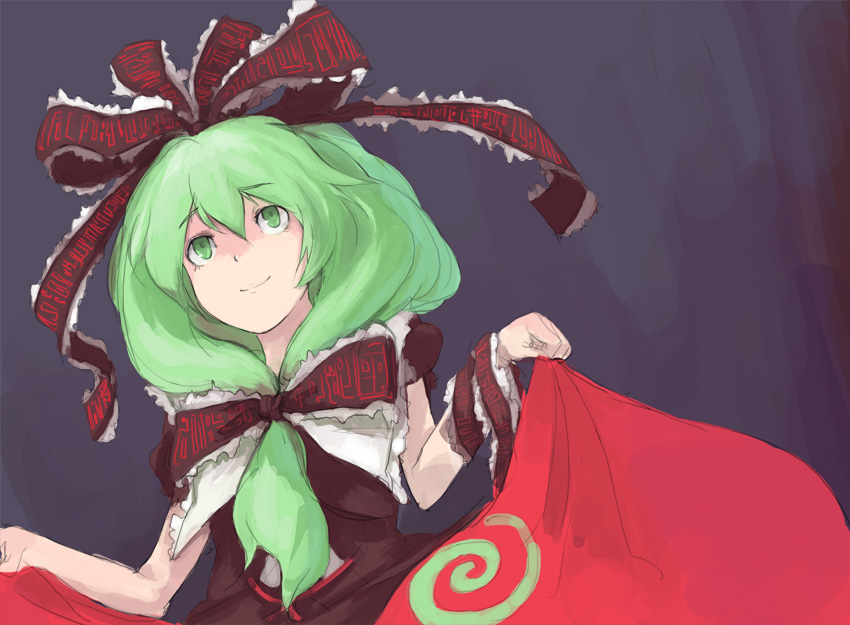 1girlbowbowtiefemale focusfrom belowfront ponytailgreen eyesgreen hairhair bowmatching hair/eyespuffy short sleevespuffy sleevesred bowred bowtieshawlshort sleevessolowrist cuffs