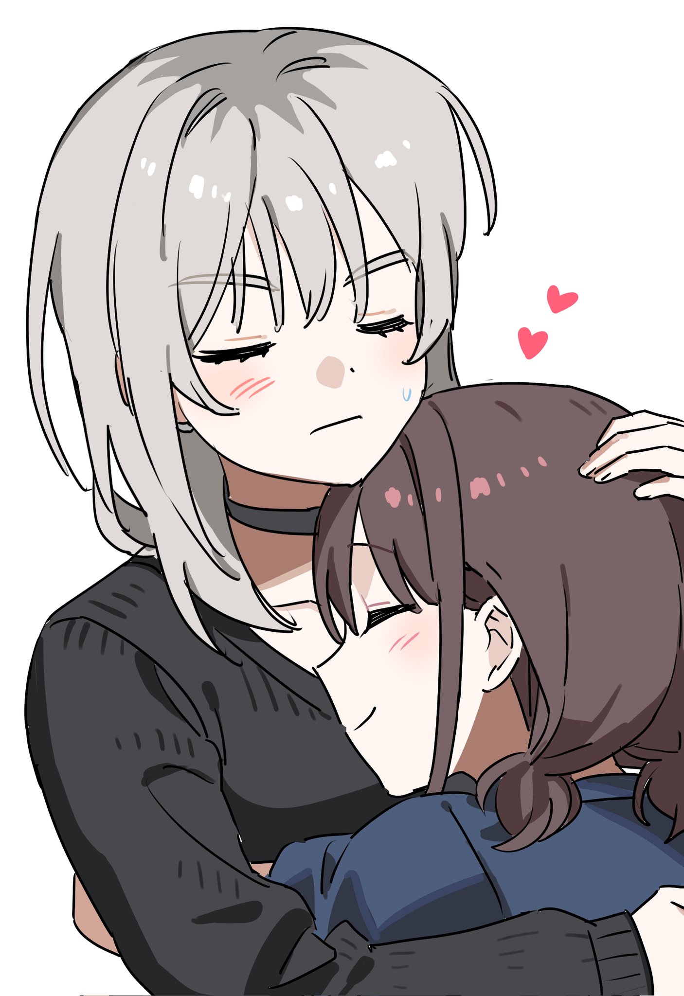2girlsblack chokerblack sweaterblue shirtbrown hairchokerclosed eyesclosed mouthgrey hairhearthuglong sleevesmulticolored hairmultiple girlsroots (hair)shirtshort twintailssimple backgroundsweatdropsweatertwintailswhite backgroundyuri