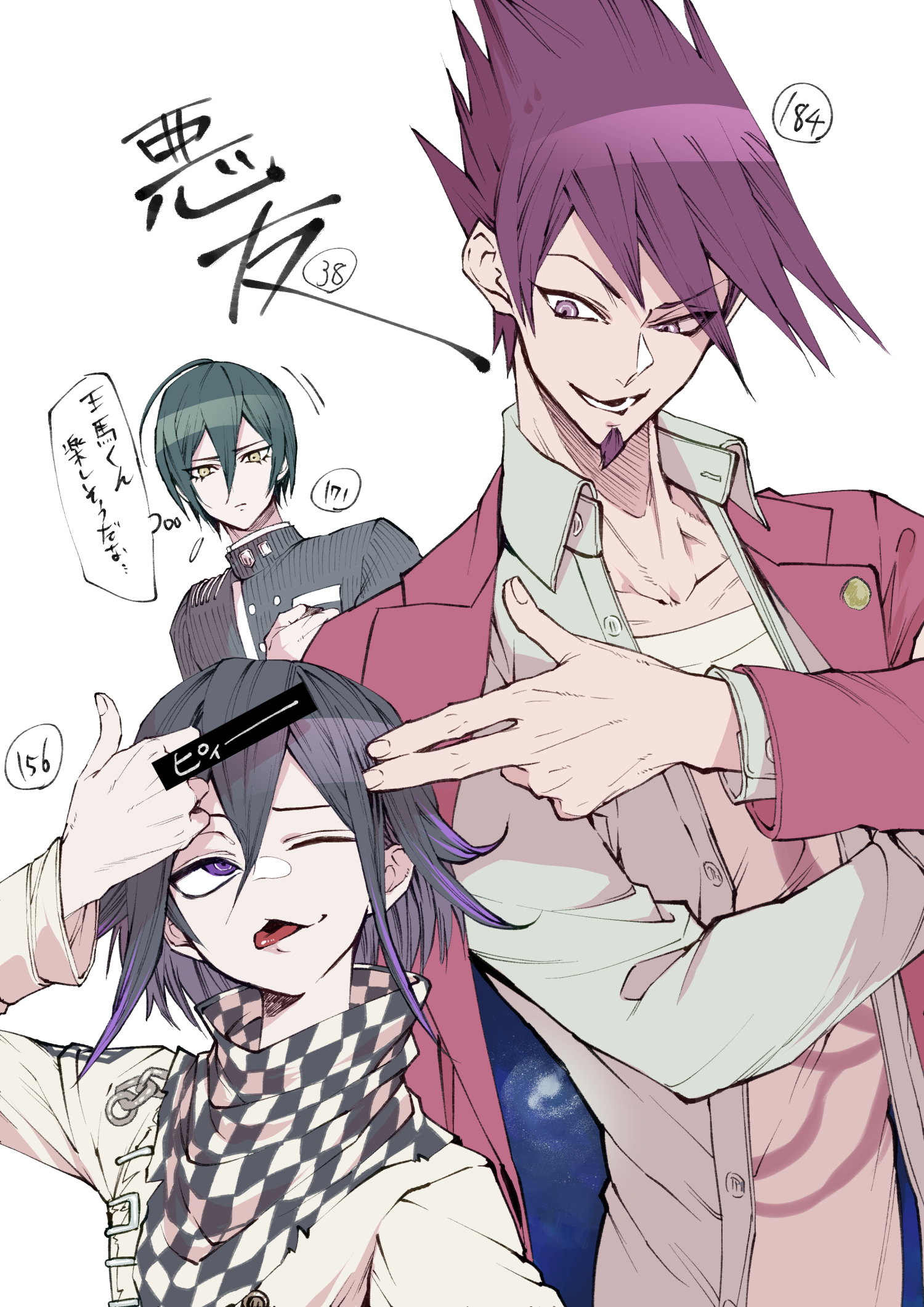 3boysahogeblack hairblack jacketbuttonscensoredcensored gesturecheckered clothescheckered scarfcollarbonecollared jacketfacial hairfinger gunfinger gun to headflipped hairgoateehair between eyesheightheight differencejacketjacket partially removedlong sleevesmale focusmiddle fingermultiple boysone eye closedopen clothesopen mouthprint shirtpurple eyespurple facial hairpurple hairscarfshirtshort hairsimple backgroundsize differencesmilespace printspeech bubblespiked hairstarry sky printthought bubbletonguetongue outtwo-tone scarfupper bodywhite backgroundwhite shirtyellow eyes