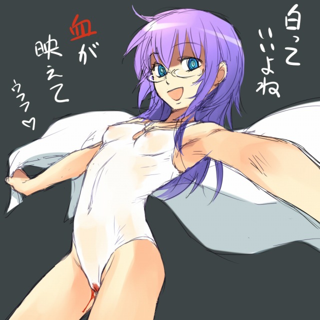 1girlarmpitsbloodblue eyesbreastsfemale focusflat chestglasseslong hairmensesmenstruationone-piece swimsuitpurple hairsketchsmall breastssoloswimsuit