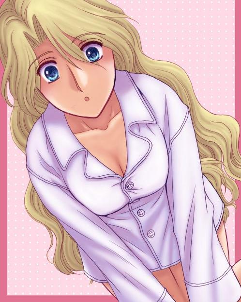 1990s (style)1girlblonde hairblue eyesbreastscleavagefemale focuskneelinglong hairlooking at vieweropen mouthpajamasretro artstylesolo
