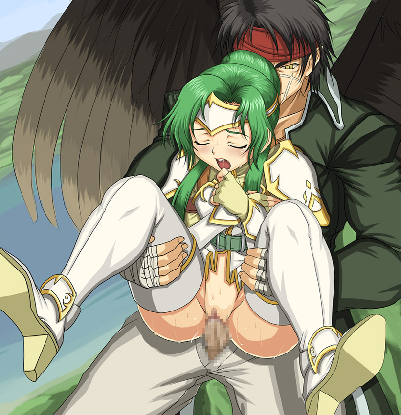 1boy1girlarmorblack hairblushbottomlesscarryingcensoredclosed eyescouplefingerless glovesglovesgreen hairhair bunhair upheadbandheterolaguz (race)mosaic censoringno pantiesopen mouthpenisprincesspussyreverse suspended congresssalivasexsex from behindspread legssweattearsthighhighsvaginalwingsyellow eyes