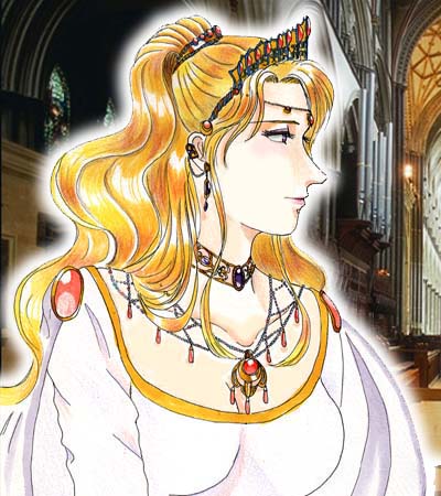 1990s (style)1girlblonde hairblue eyesbreastschokercrownfemale focusindoorsjewelrylong hairnecklaceponytailrobesolotiara