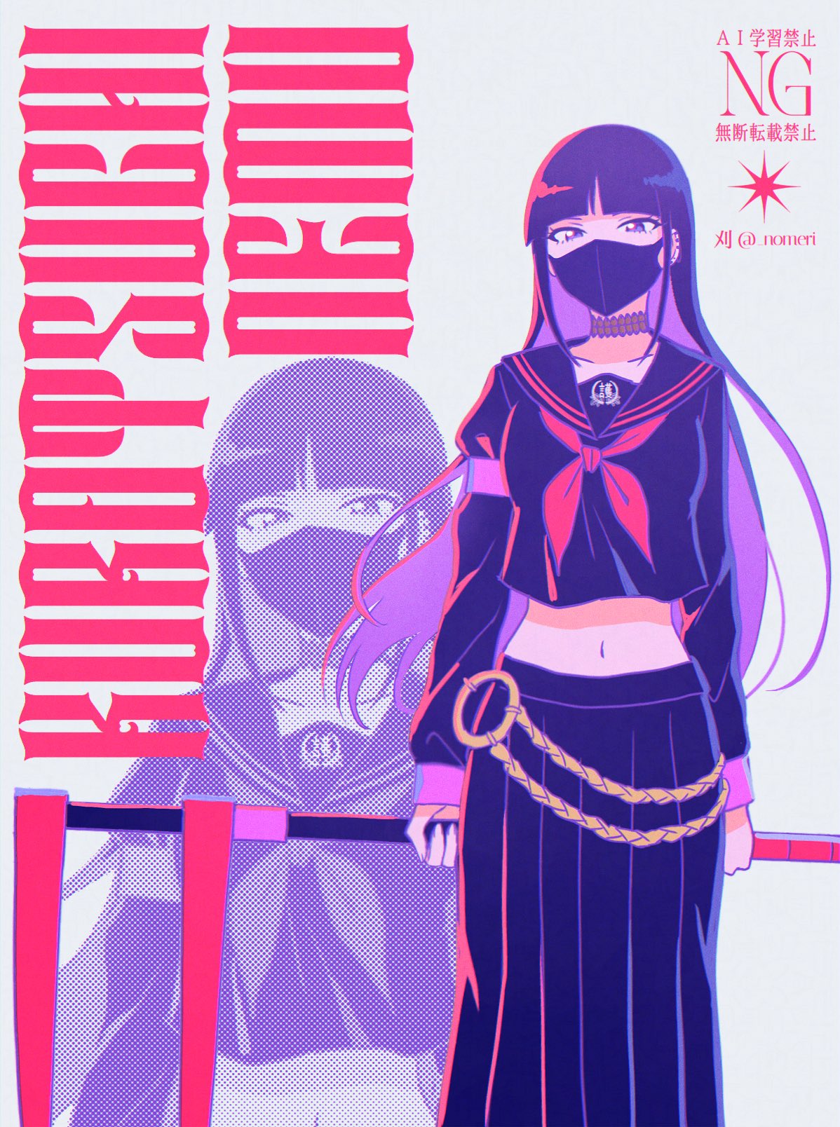 1girlblack hairbreastslong hairmaskmidriffmulticolored hairnavelpurple eyespurple hairskirtsolotwo-tone hair