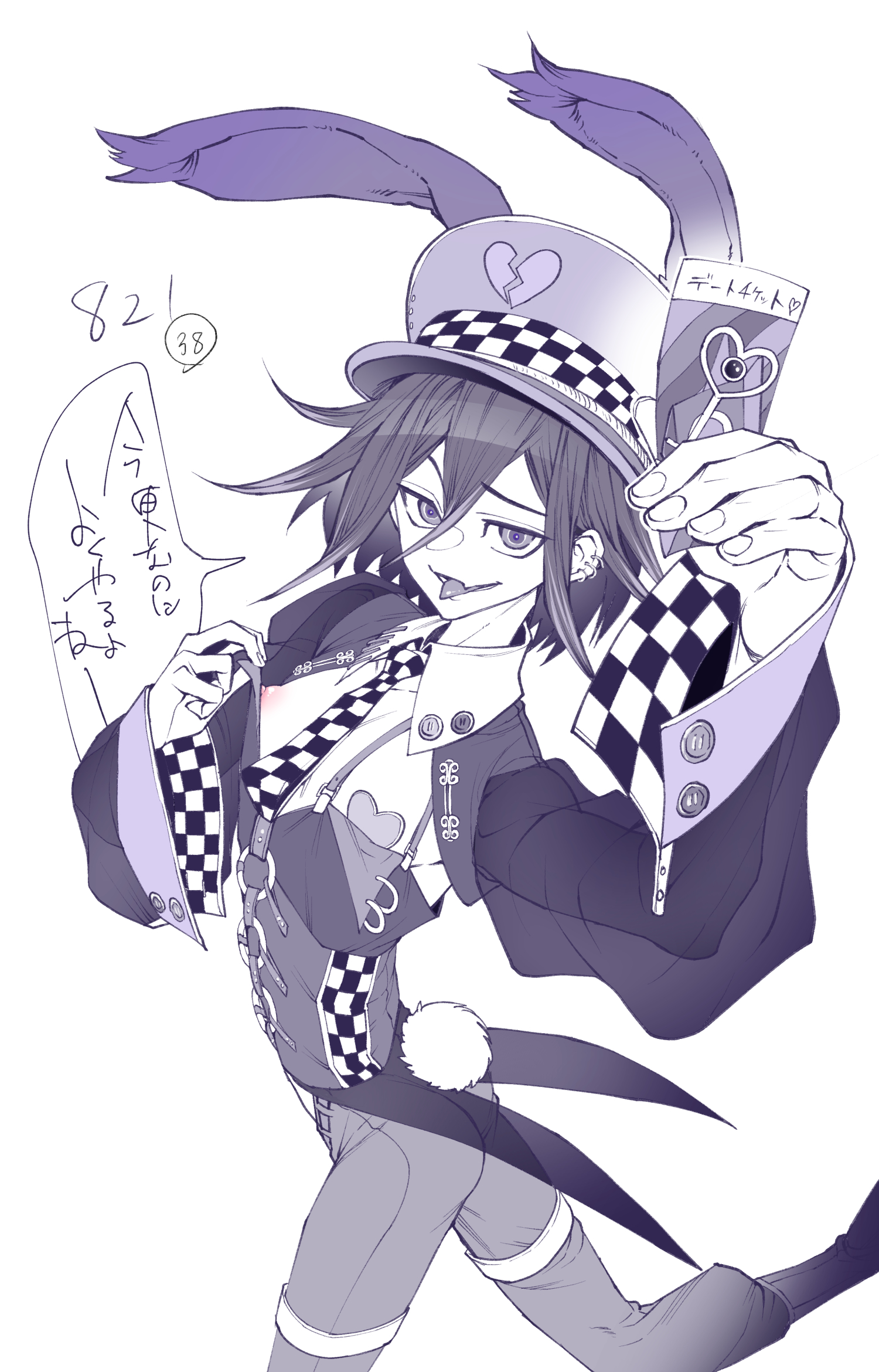 1boyalternate costumeanimal earsbuttonscheckered clothescheckered necktieear piercingfangflashingflipped hairforeshorteningfrom sidehair between eyeshatheart pastiesholdingholding ticketlong sleeveslooking at viewermale focusmedium hairmonochromenecktieo-ringpastiespiercingpuffy nipplespurple eyespurple hairpurple themerabbit boyrabbit earsrabbit tailrevealing clothesrunningsimple backgroundskin fangsmilesolospeech bubblestraptailthigh straptickettonguetongue outtop hatwhite background