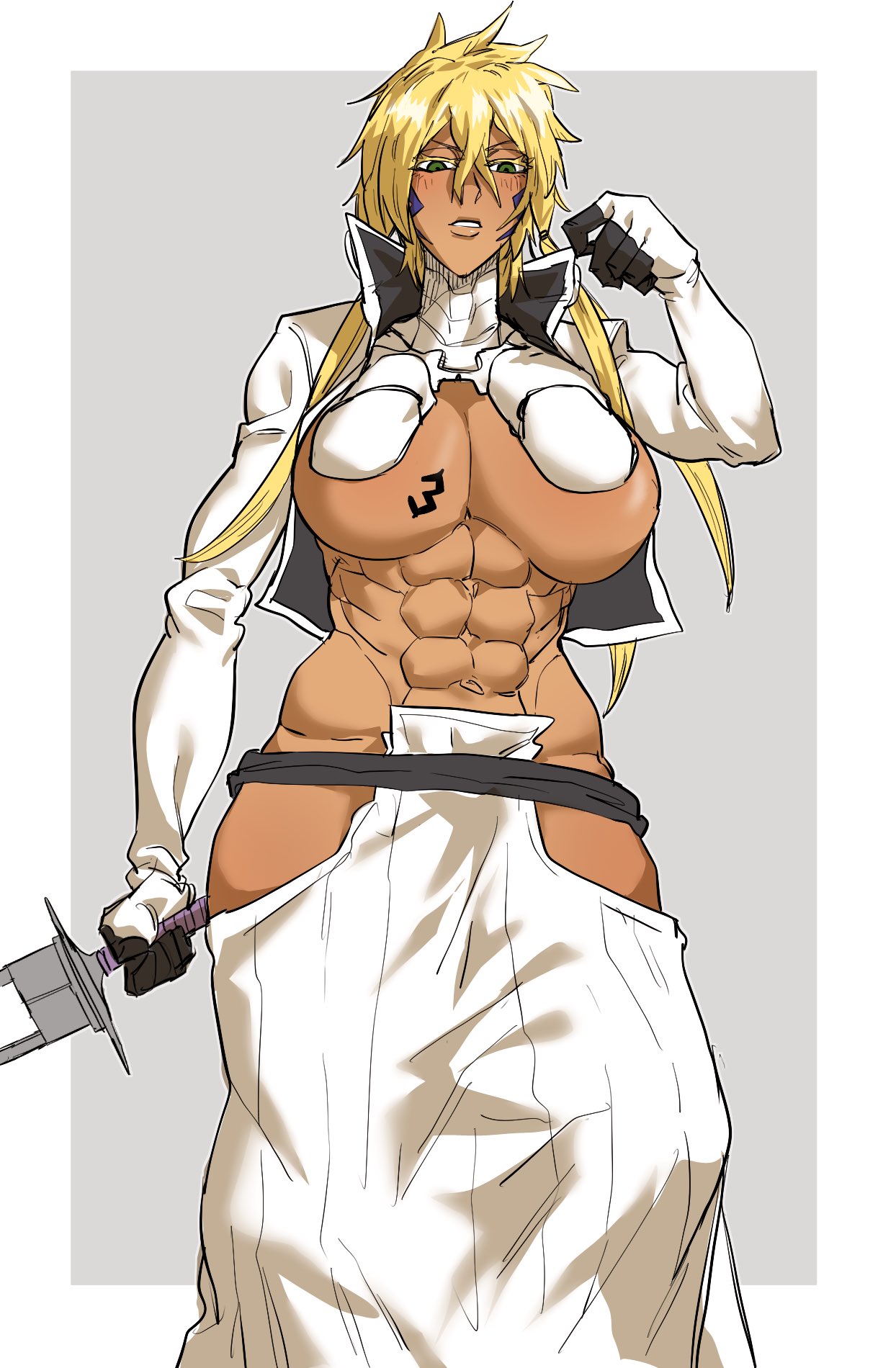 absblonde hairborderbreast tattoobreastscolored eyelashescropped jacketdark skindark-skinned femaleespadafacial markgreen eyesholdingholding swordholding weaponlarge breastsmedium hairnumber tattoosimple backgroundsolosolo focusstandingswordtattoothighsunderboobunzippedweaponwhite border