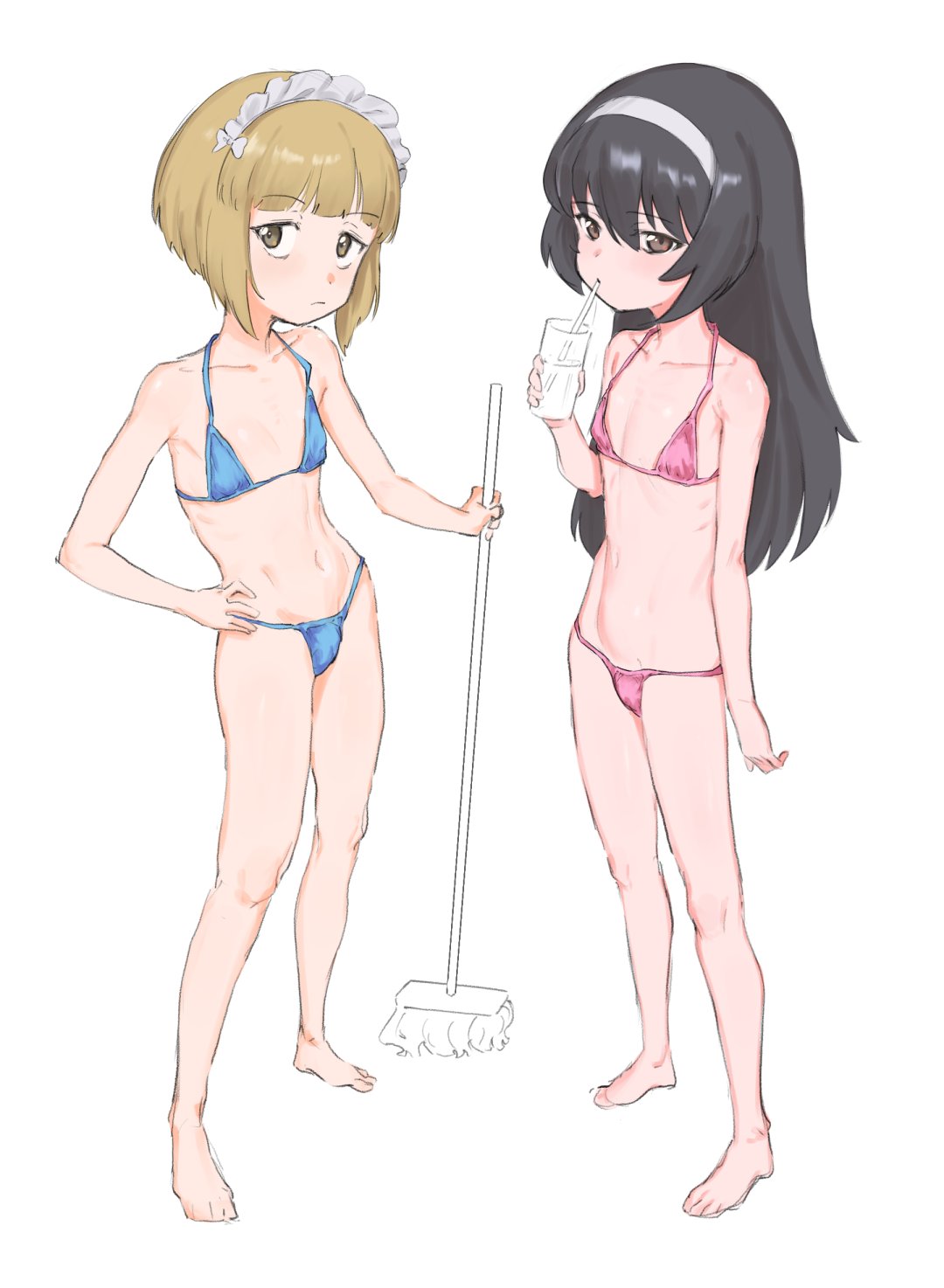 2girlsbikiniblack hairblonde hairbob cutbrown eyescleaning poolflat chesthairbandhands on own hipsinverted boblong hairmaid headdressmicro bikinimopmultiple girlspetiteshort hairsimple backgroundskinnyswimsuitwhite background