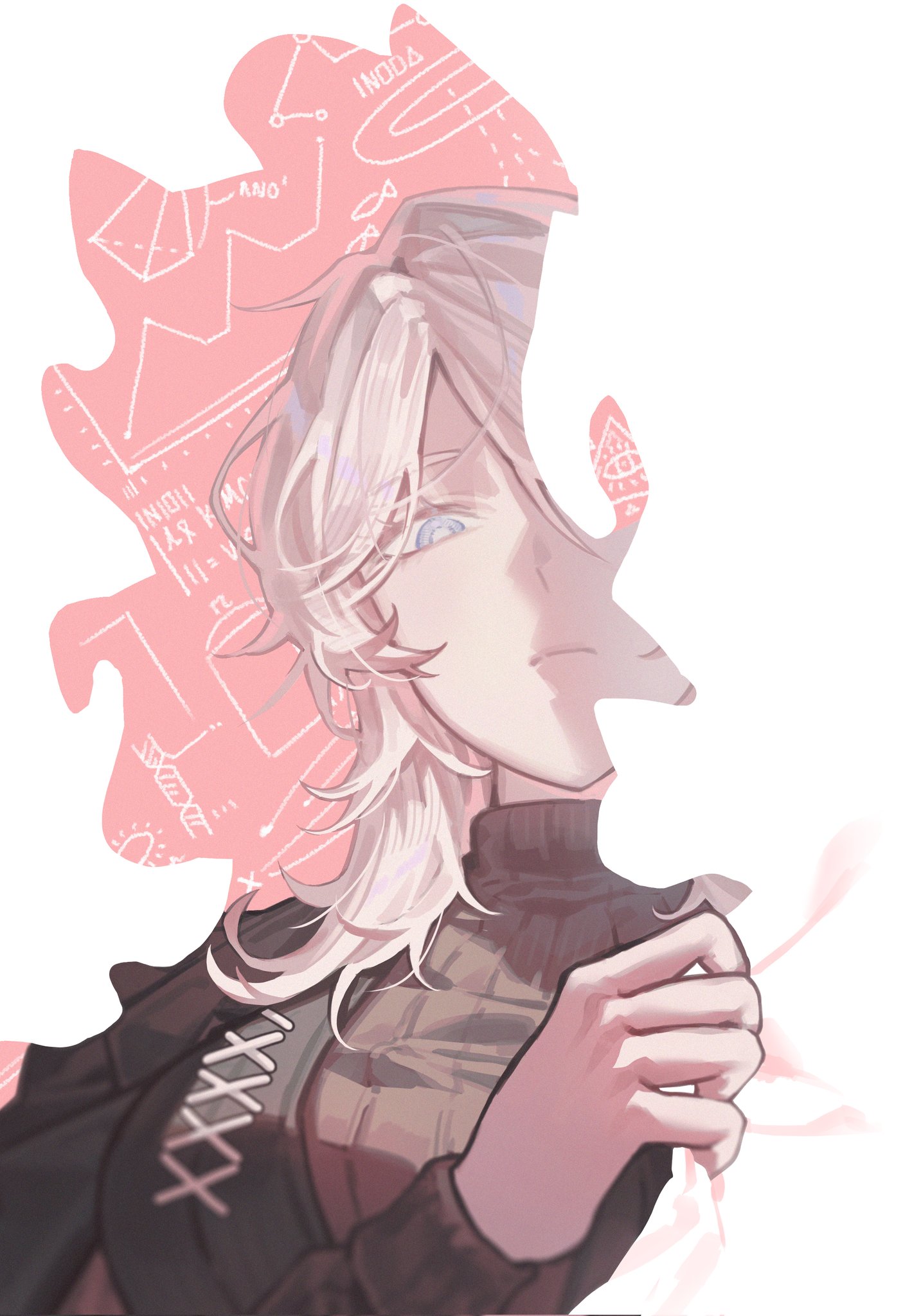 1girlahemsehszlfmfblack coatblack vestblue eyesclosed mouthcoatgrey sweaterlong sleeveslooking at viewerpink backgroundshort hairsimple backgroundsolosweaterupper bodyvestwhite backgroundwhite hair