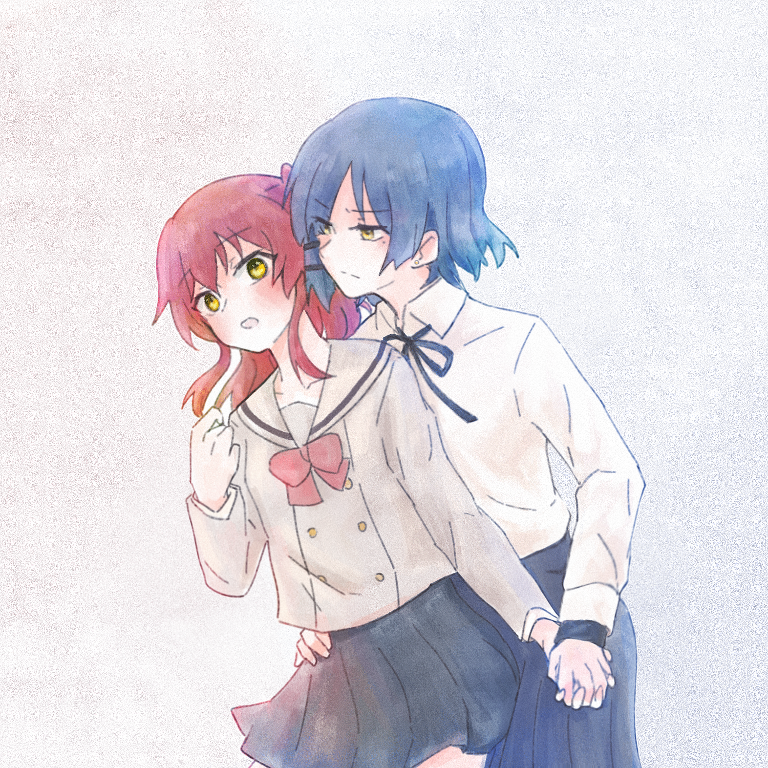 black bowblue hairblushbowbowtieforced huggrabbing from behindhair ornamenthand grabholdingholding handshughug from behindjacketlong hairlong sleevesmolemole under eyemultiple girlsnarrowed eyesopen mouthred bowred hairschool uniformshirtshort hairside ponytailsimple backgroundskirtsurprisedwhite shirtyellow eyesyuri