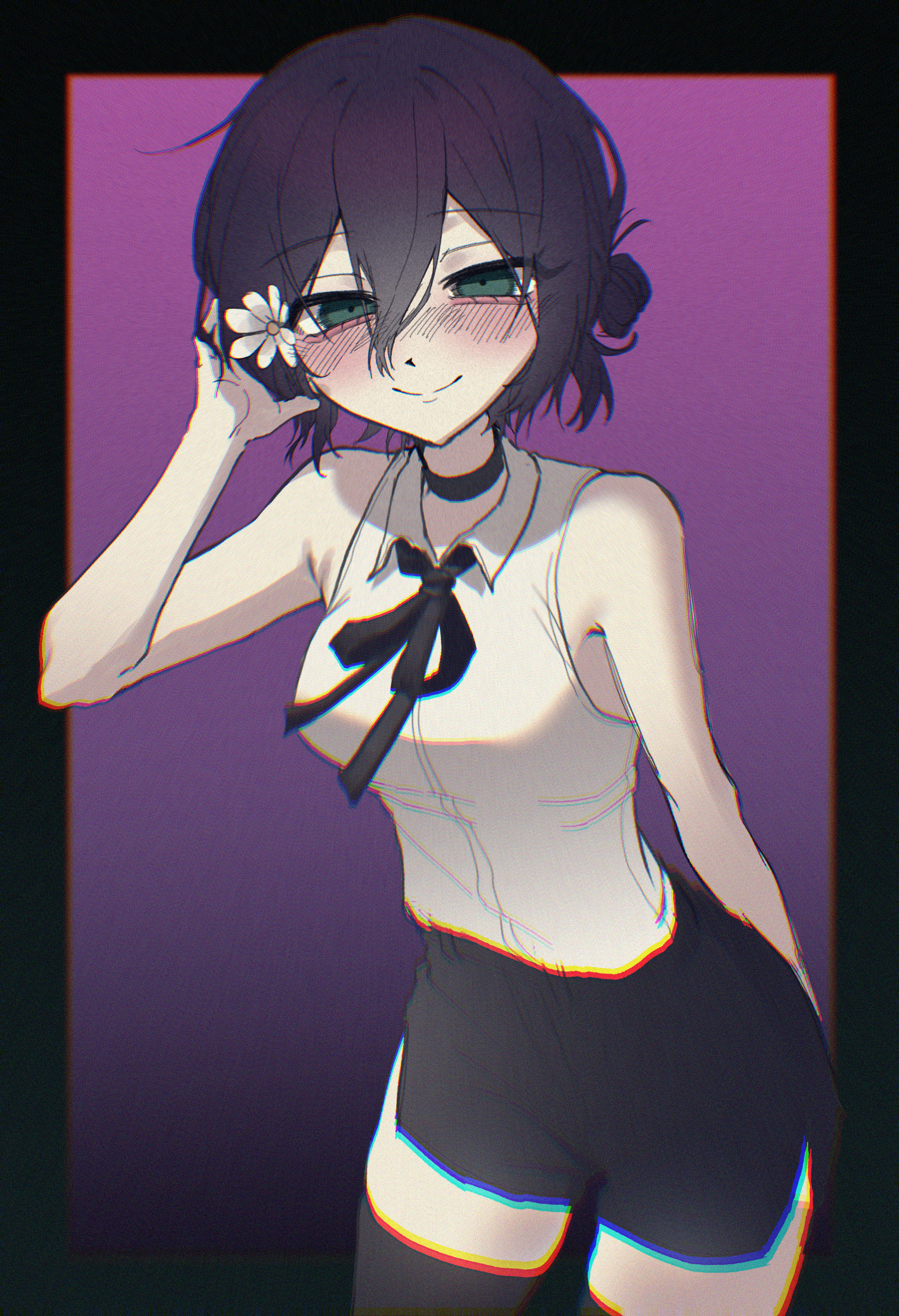 1girlblack chokerblack hairblack ribbonblack shortsblack thighhighschokerchromatic aberrationclosed mouthcollared shirtflowergreen eyeshair between eyeshair bunhair flowerhair ornamentneck ribbonpurple backgroundribbonshirtshirt tucked inshortssleevelesssleeveless shirtsmilesolothighhighswhite flowerwhite shirt