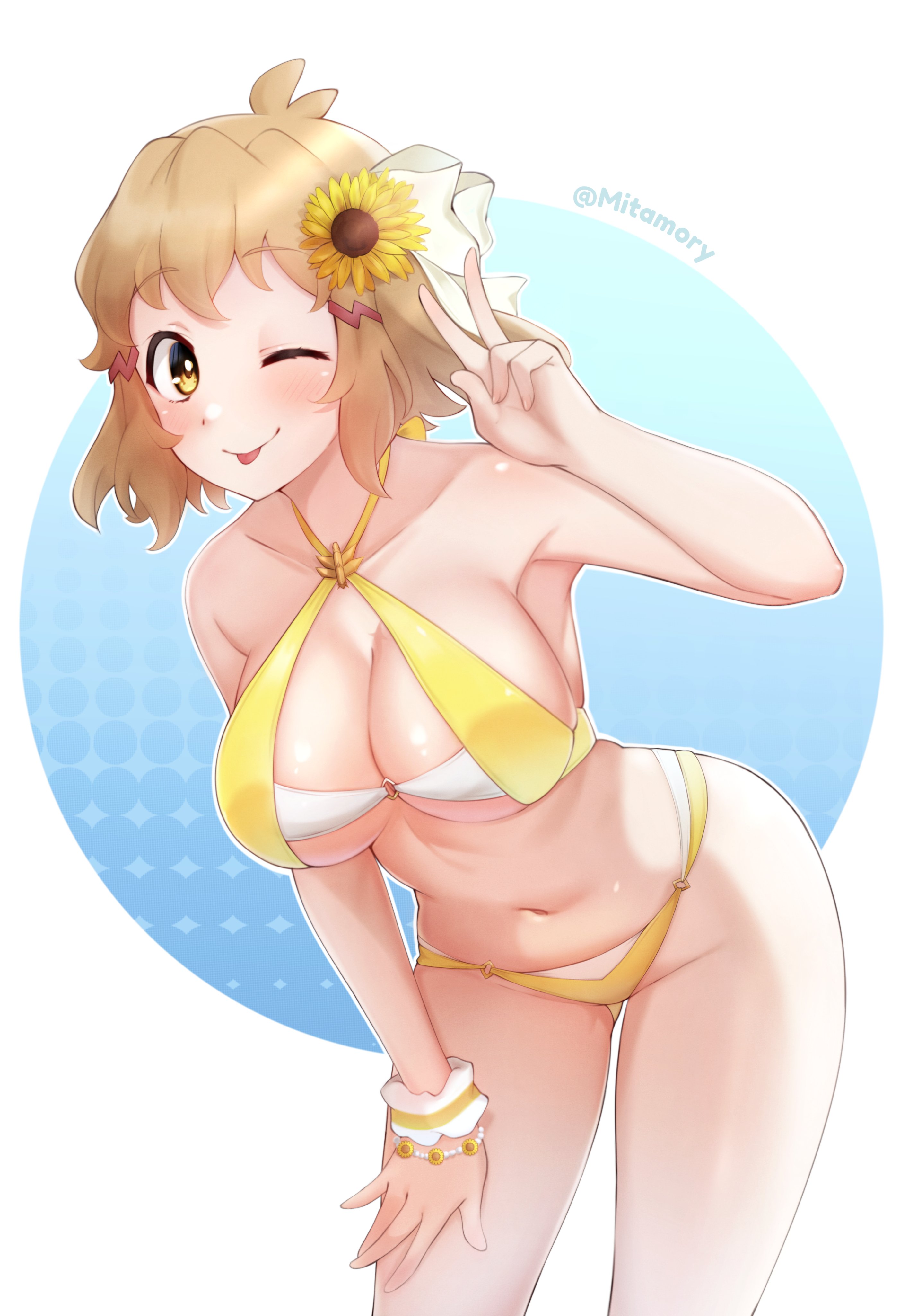 :p1girlbikinibowbraceletbreastsbrown haircowboy shotcriss-cross halterflowerhair bowhair flowerhair ornamenthaircliphalterneckhand on own thighjewelrylarge breastslayered bikinileaning forwardlooking at viewernavelo-ringo-ring bikiniofficial alternate costumeone eye closedscrunchieshort hairsolosunflowersunflower hair ornamentswimsuitsymphogear pendanttonguetongue outtwitter usernamewwhite bowwrist scrunchieyellow bikiniyellow eyes