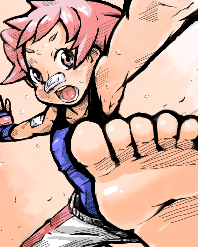 rizu (rizunm), maruko gaku, the hundred line -last defense academy-, 1boy, black hair, black shoes, blue background, blue hat, blue jacket, blue pants, crying, crying with eyes open, flying sweatdrops, hands up, hat, jacket, looking at viewer, male focus, open mouth, pants, patchwork clothes, red eyes, shirt, shoes, simple background, solo, tears, visor cap, white shirt