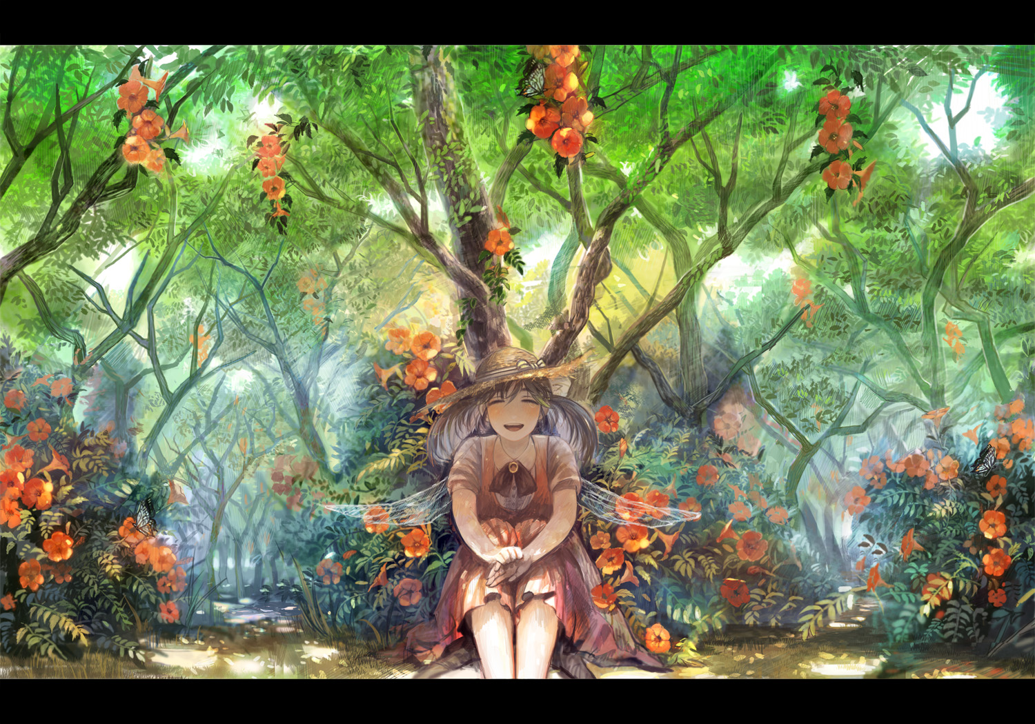 1boy1girlbrown hairbugbutterflyclosed eyesdappled sunlightdaydressfairy wingsfemale focusflowerhatinsectletterboxedlong hairnatureoutdoorspinafore dressplantscenerysittingsleevelesssleeveless dresssolosunlighttwintailswings