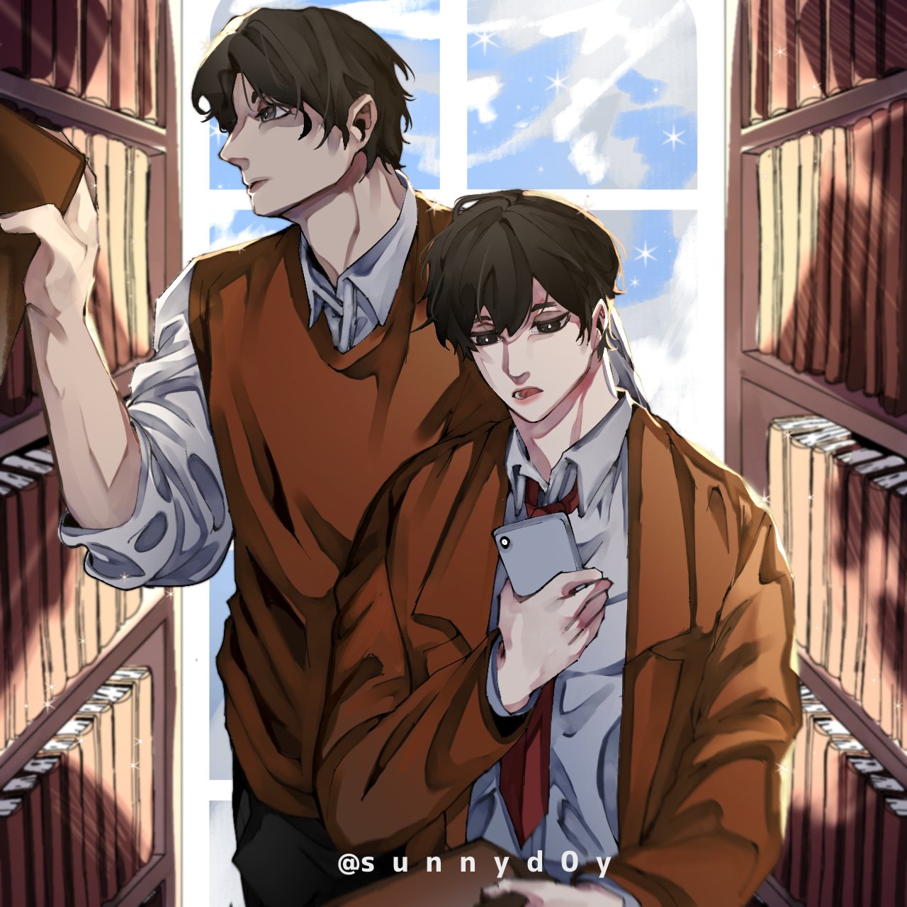 2boysbacklightingblack eyesblack hairbookbright pupilsbrown coatbrown vestcoatcollared shirthead tiltholdingholding bookholding phonein-franchise crossoverlibrarylooking at phonemultiple boysnecktieopen clothesopen coatopen mouthphonered necktieshirtshort hairsleeves rolled upsunnyd00yvestwalkingwhite pupilswhite shirtwindow