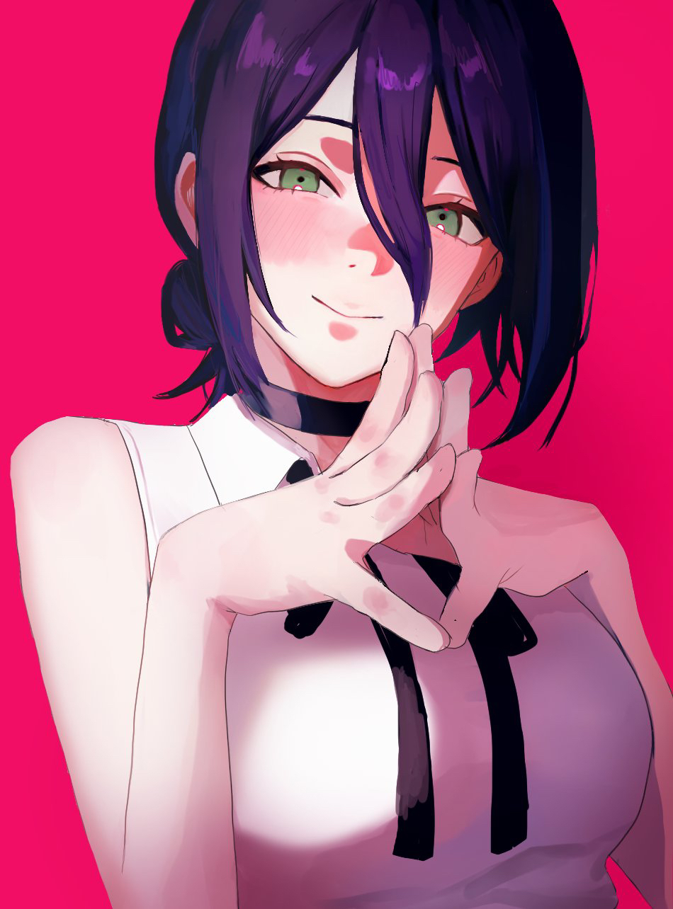 1girlblack ribbonbreastsclosed mouthcollared shirtgreen eyeshair between eyeshair bunlooking at viewermedium breastsneck ribbonown hands togetherpink backgroundpurple hairribbonshirtsimple backgroundsleevelesssleeveless shirtsmilesolowhite shirt