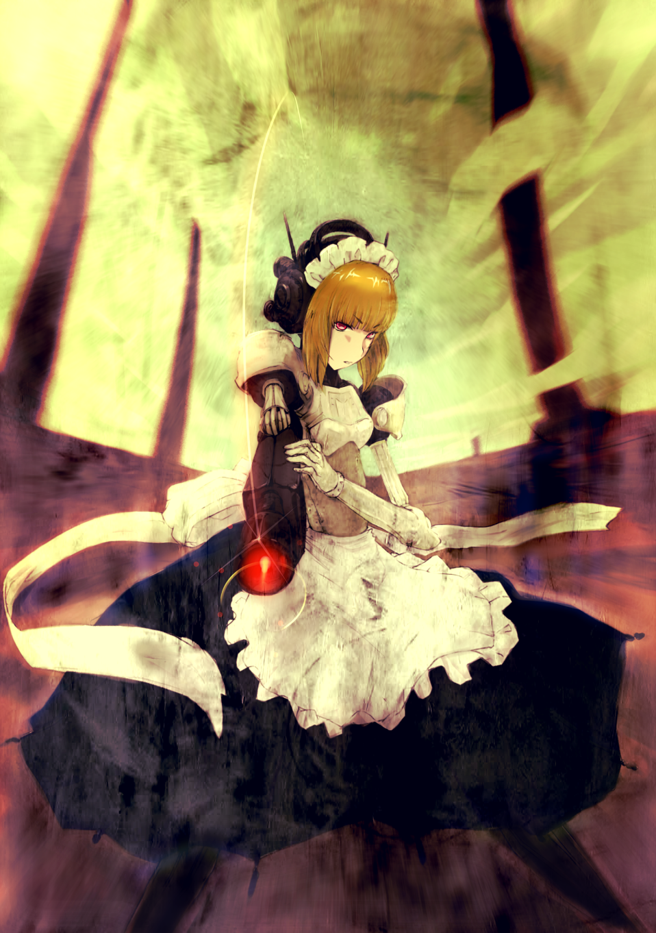 1girlaimingaiming at viewerandroidapronarm cannonback bowblack skirtbowbreastsfeet out of framefighting stancefloating clothesfrilled apronfrillshand on own armhead downlarge bowlegs apartlight traillooking at viewermaidmaid apronmaid headdressmechanical armsorange hairoutdoorsparted lipspillarred eyesshort hairsideways glanceskirtskysmall breastssolostandingv-shaped eyebrowswaist apronweaponwhite apronwhite bowwhite headdressyellow sky