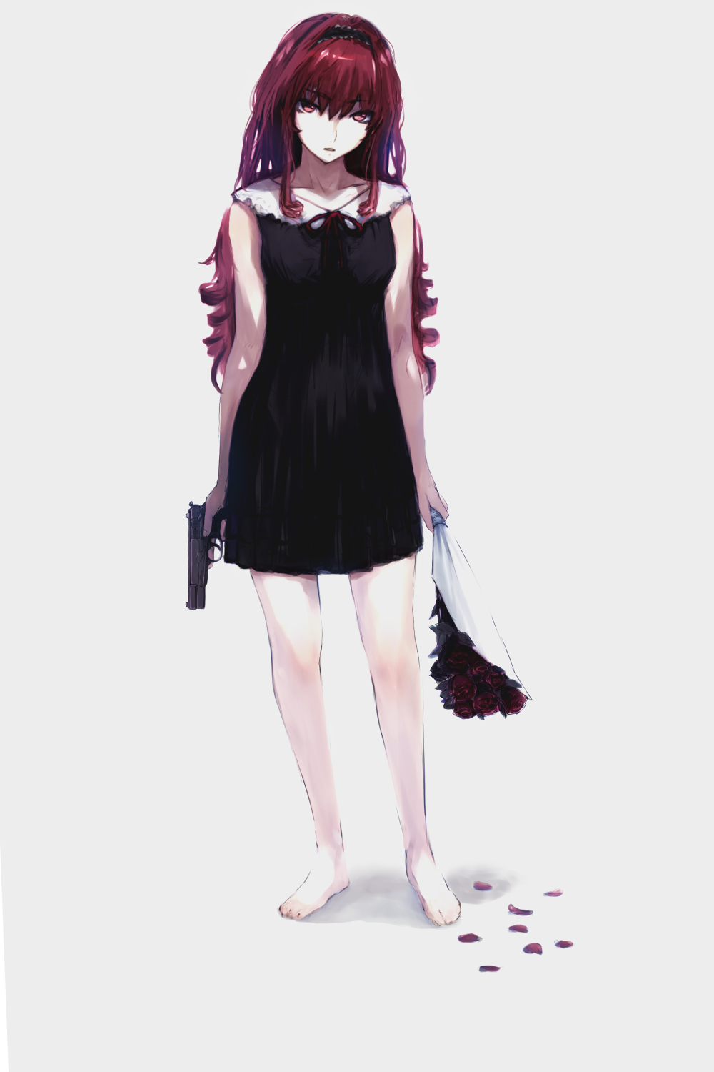 1girlarms at sidesbare armsbare legsbarefootblack dressblack hairbandbouquetbreastscollarbonedressflowerfull bodygunhairbandhandgunhead tiltholdingholding bouquetholding gunholding weaponlong hairlooking at viewermedium breastsneck ribbonparted lipsred eyesred flowerred hairred ribbonred roseribbonringletsroseshort dresssidelockssimple backgroundsolostandingtrigger disciplineweaponwhite background