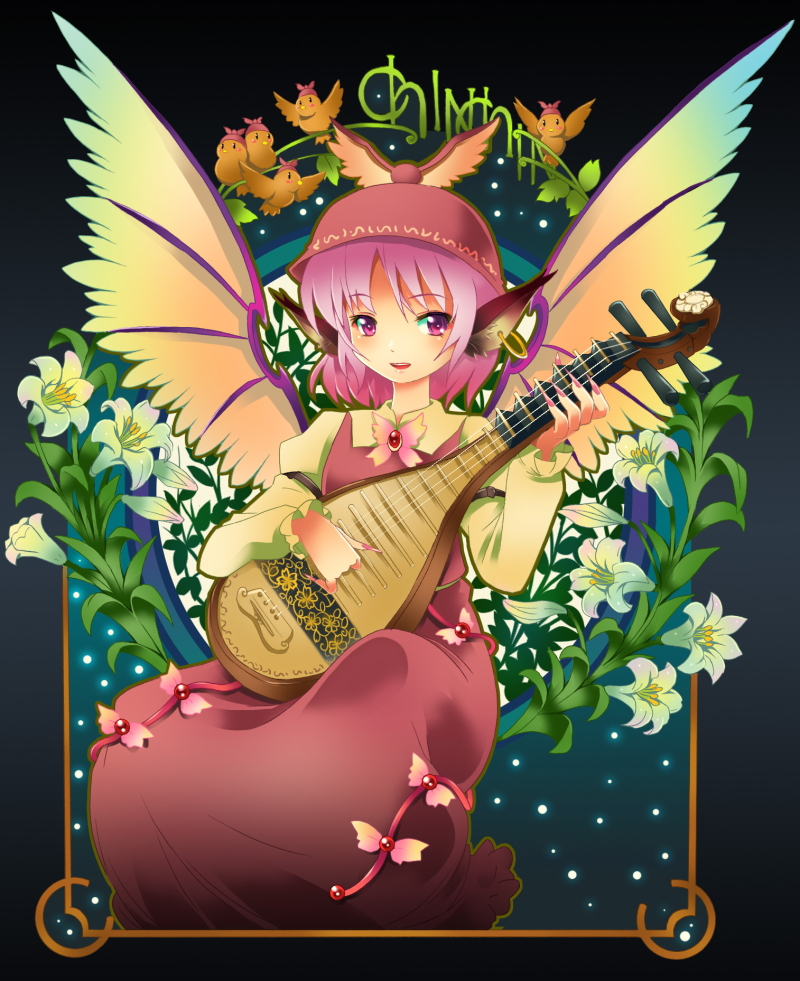 1girlanimal earsart nouveaubirdbiwa luteearringsfemale focusfingernailsflowerhatinstrumentjewelrylily (flower)long fingernailslute (instrument)nail (hardware)pink eyespink hairshort hairsolowings