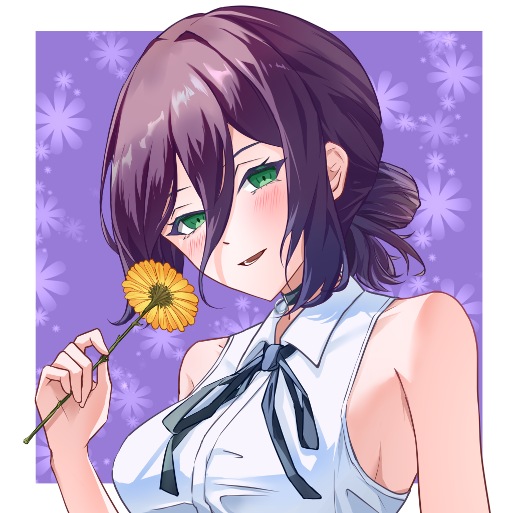 1girlblack chokerblack ribbonblushbreastschokercollared shirtflowergreen eyesgrenade pinhair between eyesholdingholding flowerjung 6unflooking at viewermedium breastsneck ribbonpurple hairribbonshirtsideboobsleevelesssleeveless shirtsolowhite shirtyellow flower