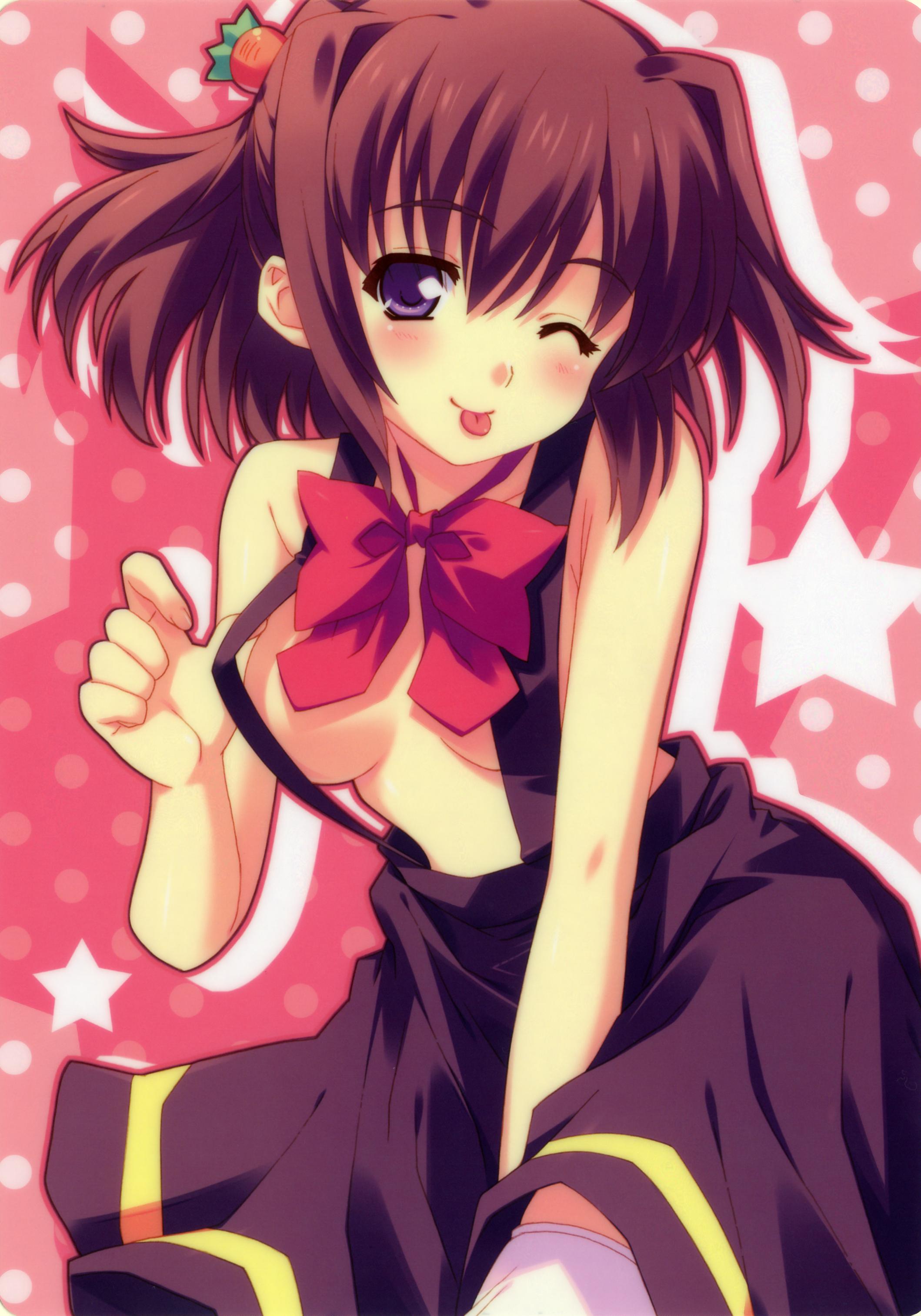 :p1girlbrown haircarrot hair ornamentfemale focusfood-themed hair ornamenthair ornamentone eye closedpurple eyessolothighhighstonguetongue outwink
