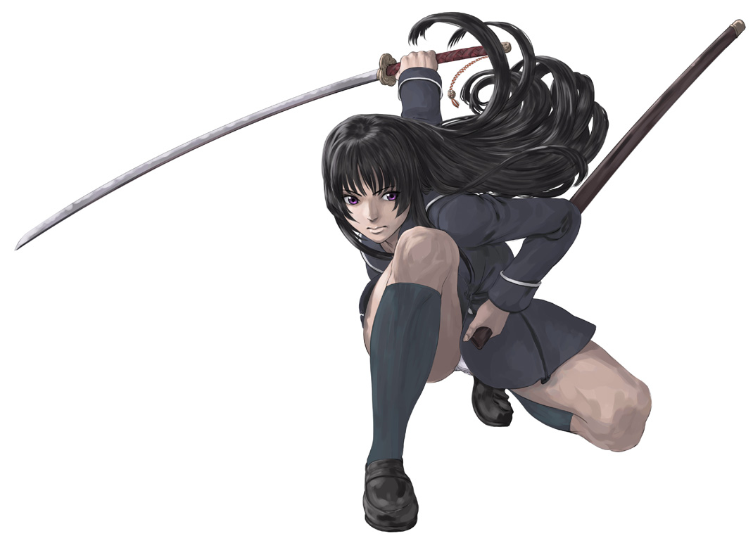 00s1girlblack hairfemale focuskatanakneehighskneelinglong hairon one kneepantiespantyshotpurple eyesschool uniformsheathsockssolosquattingswordunderwearupskirtweapon