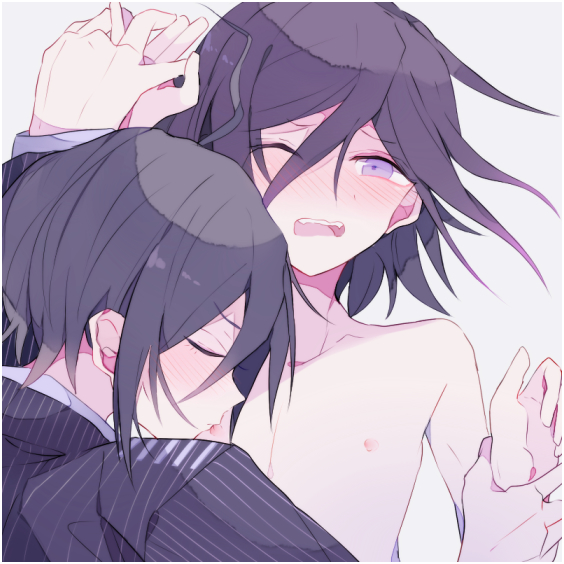 2boysblack hairblack jacketblushborderclosed eyescollarbonecollared jacketdot nosefangsfurrowed browgrey backgroundhair between eyesholding another's wristholding handsinterlocked fingersjacketlong hair between eyesmale focusmultiple boysone eye closedopen mouthpectoralspinstripe patternpurple eyespurple hairshort hairsimple backgroundsucking male nippleteethtopless maleundershirtupper bodyupper teeth onlywavy mouthwhite borderyaoi