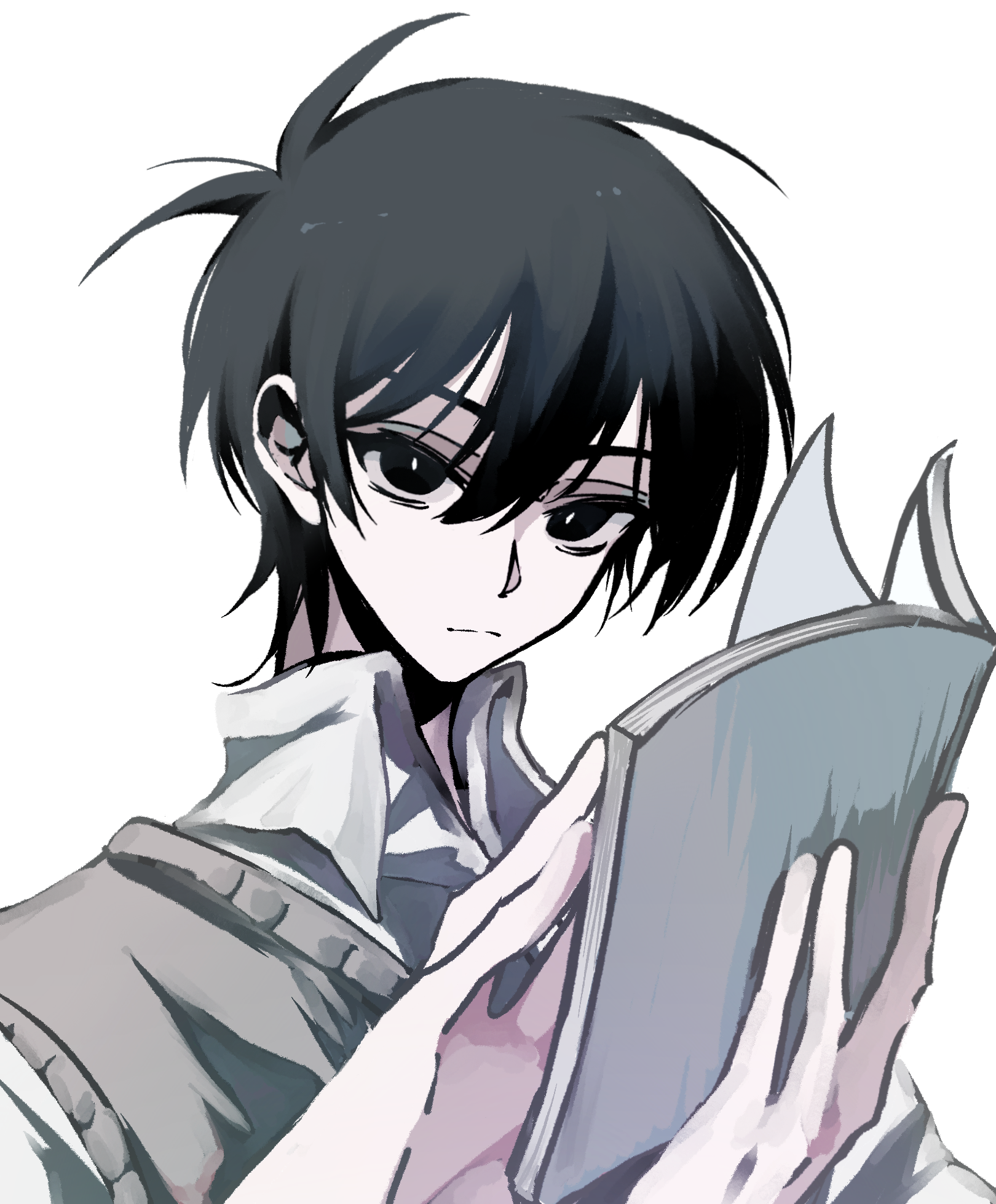 1boyantenna hairblack eyesblack hairblack sweater vestbookclosed mouthcollared shirthair between eyesholdingholding booklooking at viewermale focusshirtshort hairsimple backgroundsolosweater vestupper bodywhite backgroundwhite shirt