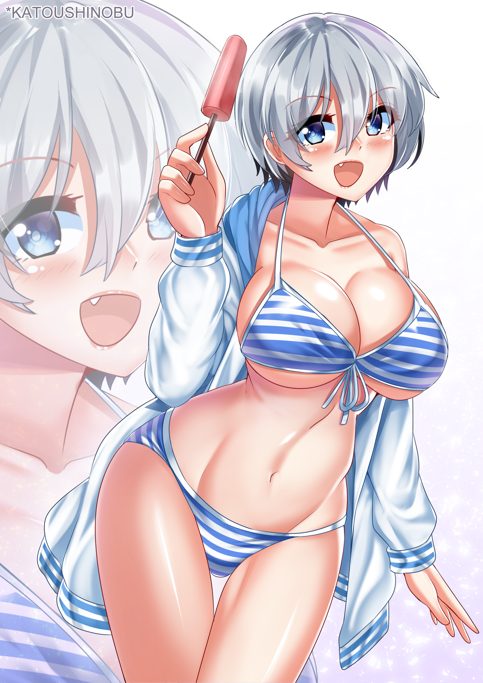 1girlartist namebikiniblue bikiniblue eyesblushbreastscleavagecollarbonecowboy shotfangfoodfront-tie bikini topfront-tie topgrey hairholdingholding foodholding popsiclejacketlarge breastslong sleeveslooking at viewernavelopen mouthpopsicleshort hairsingle off shouldersmilesolostriped bikinistriped clothesswimsuitwhite jacketzoom layer