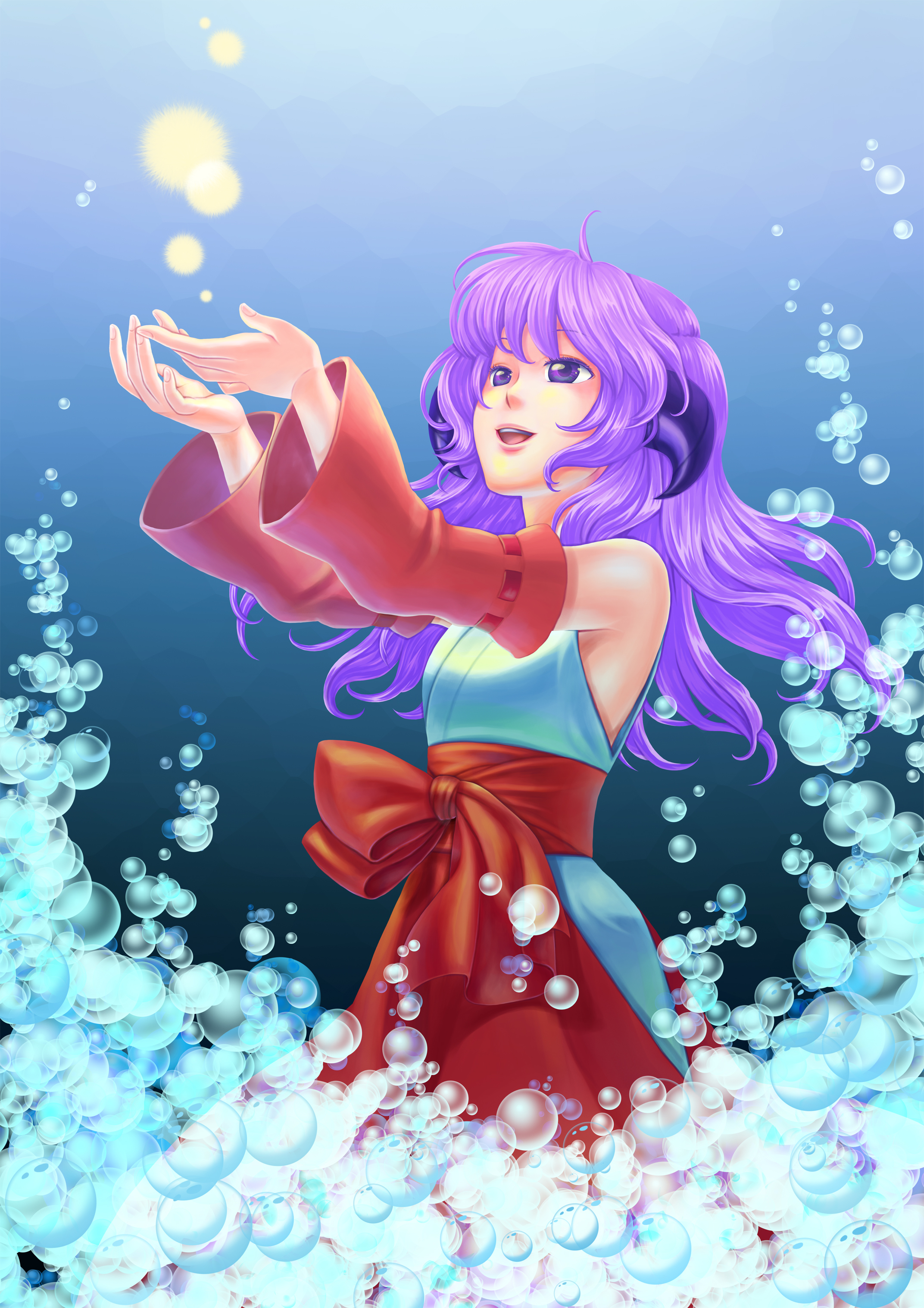 00s1girlbubbledetached sleevesfemale focushakamahakama skirthornsjapanese clotheslong hairmikopurple eyespurple hairred hakamaskirtsolo