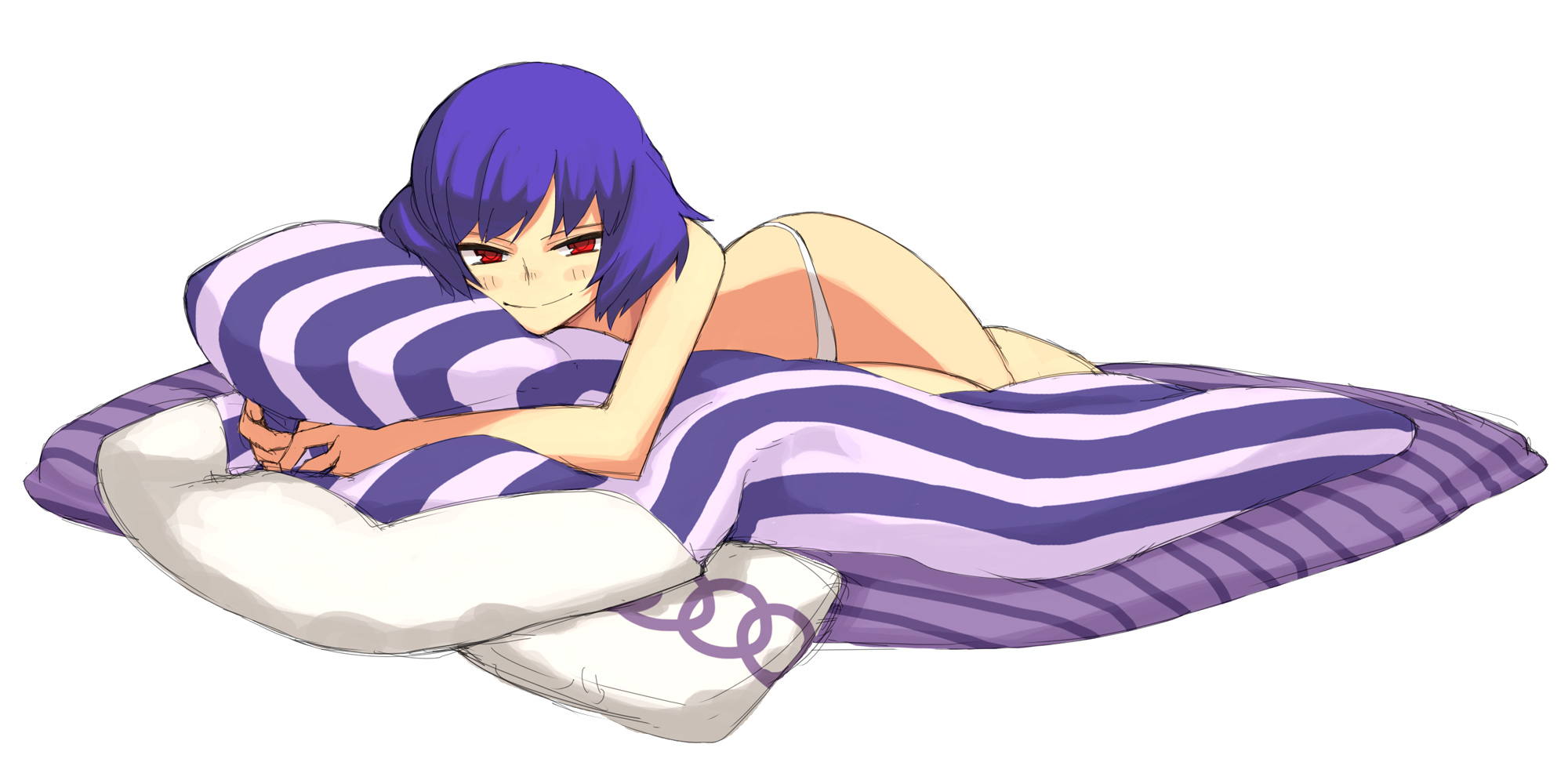 1girlfemale focusfutongrinlyingon stomachpantiespurple hairred eyesshort hairsmilesolotopless femaleunderwearunderwear only