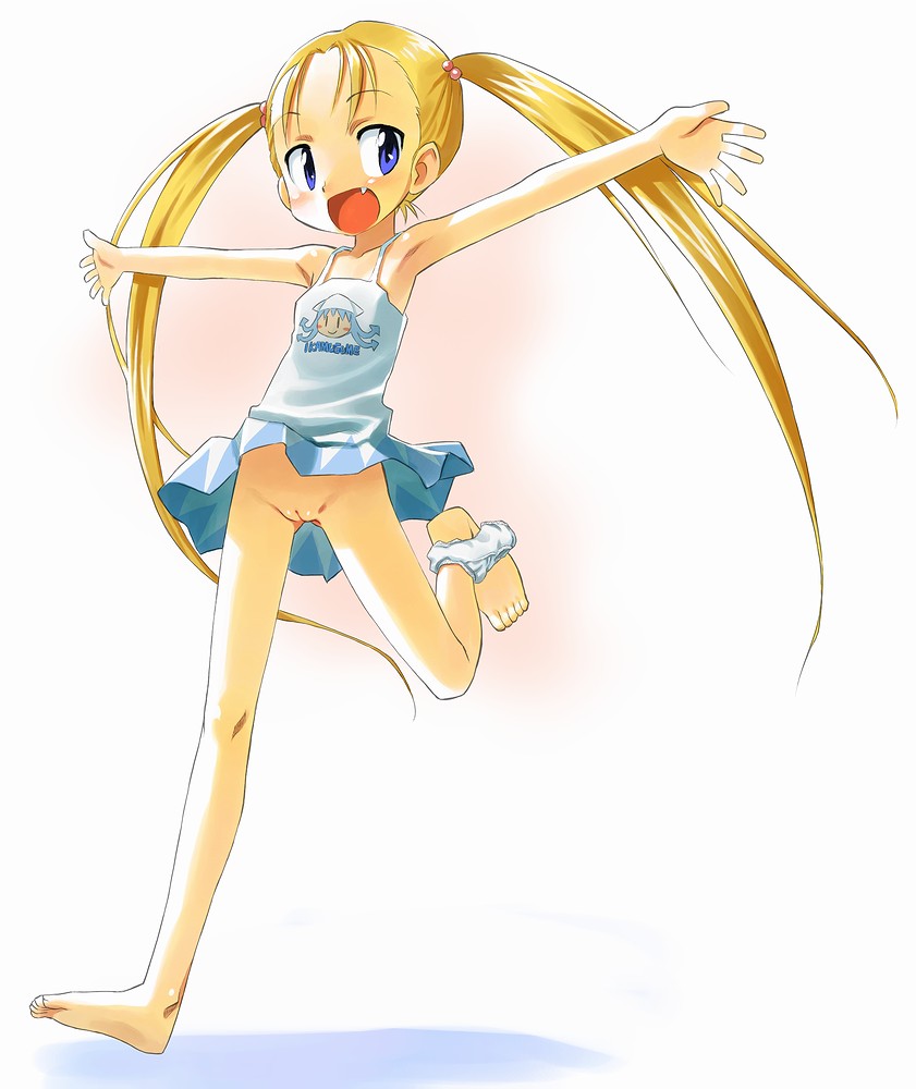 1girlarmpitsbare legsbarefootblonde hairblue eyesblushbottomlesscameocleft of venusdressfangfeetfemale focusfull bodygradient backgroundhair bobbleshair ornamentlolilong hairminiskirtopen mouthoutstretched armspantiespanties around legpussyrunningsimple backgroundskirtsolessolospread armsspread legstoestwintailsuncensoredunderwearupskirtwhite panties