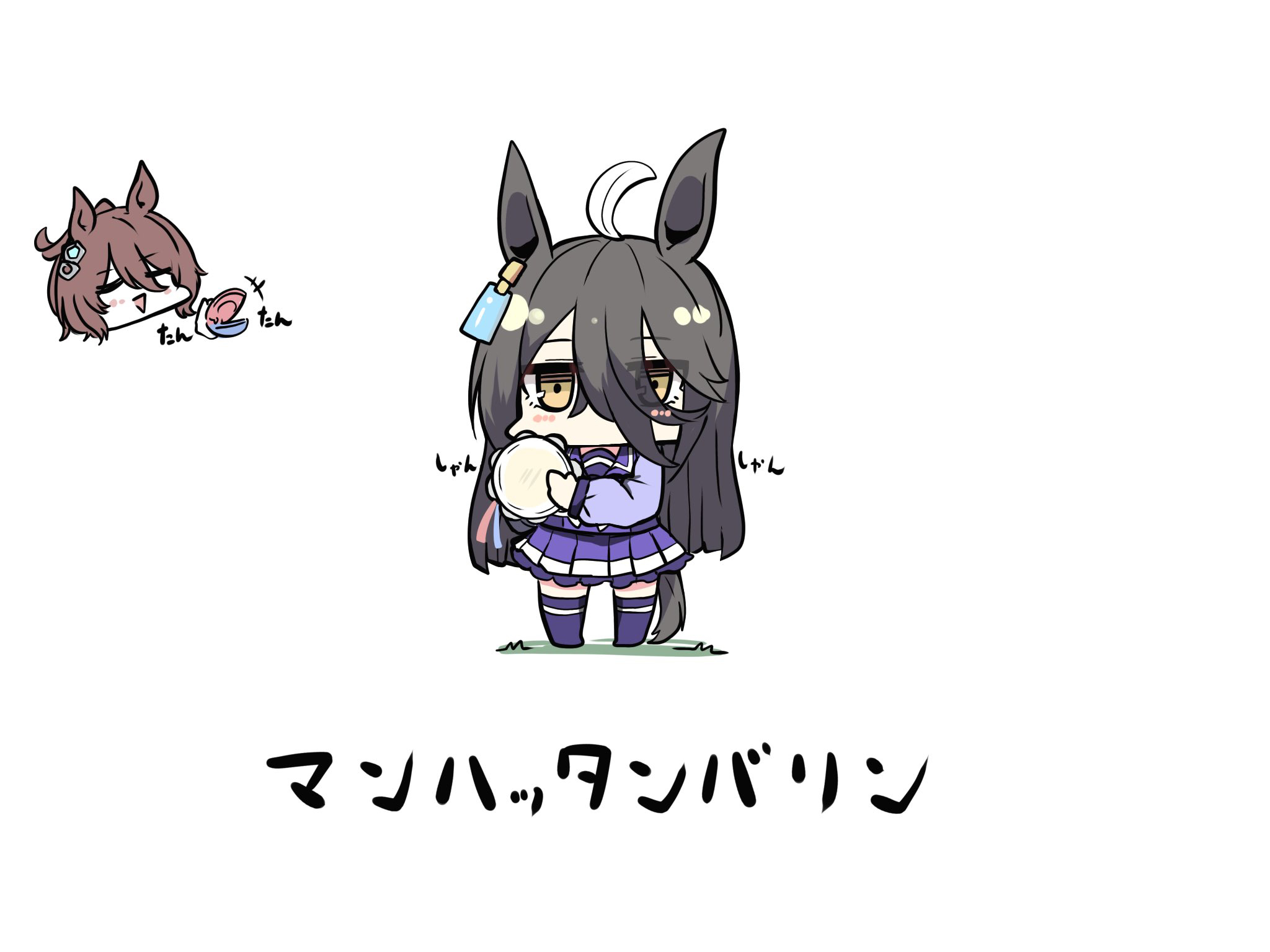 1boy2girlsanimal earsblack hairblushbrown eyesbrown hairchibiclosed eyeseyes visible through hairhair between eyesholdingholding instrumenthorse earshorse girlhorse tailinstrumentmultiple girlsparted lipspleated skirtpurple shirtpurple skirtpurple thighhighsschool uniformshirtsimple backgroundskirtsmilesolo focustailtambourinethighhighstracen school uniformtriangle mouthwhite background