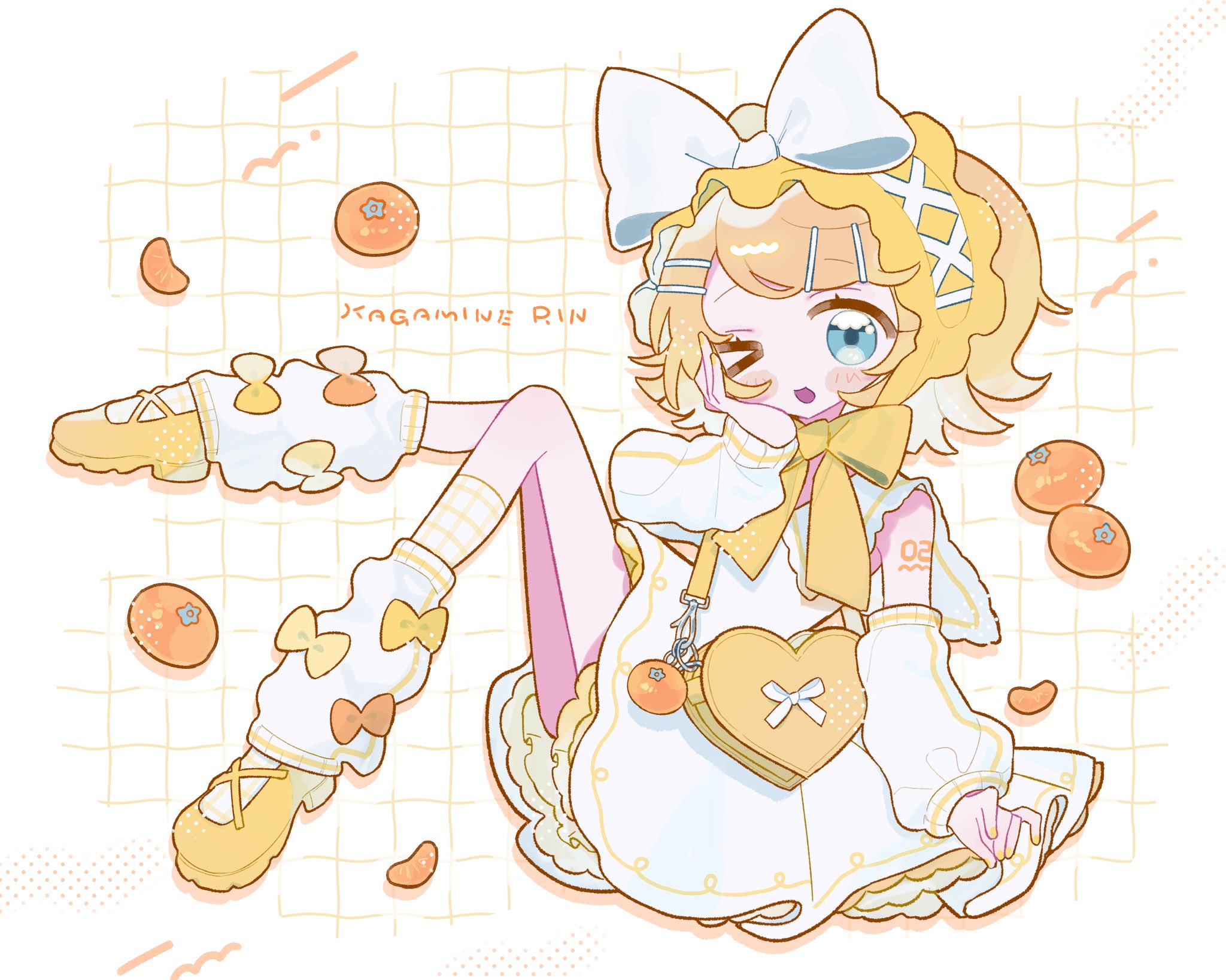 1girlaqua eyesblonde hairblush stickersbonnetbowdetached sleevesdoodle backgrounddressfoodfrilled dressfrillsfruithair ornamenthaircliphand on own cheekhand on own facelarge bowleg warmerslegs uplooking at viewernumber tattooone eye closedorange (fruit)puffy sleevesshoesshort hairsolotattooyellow bonnetyellow nailsyellow shoesyellow theme