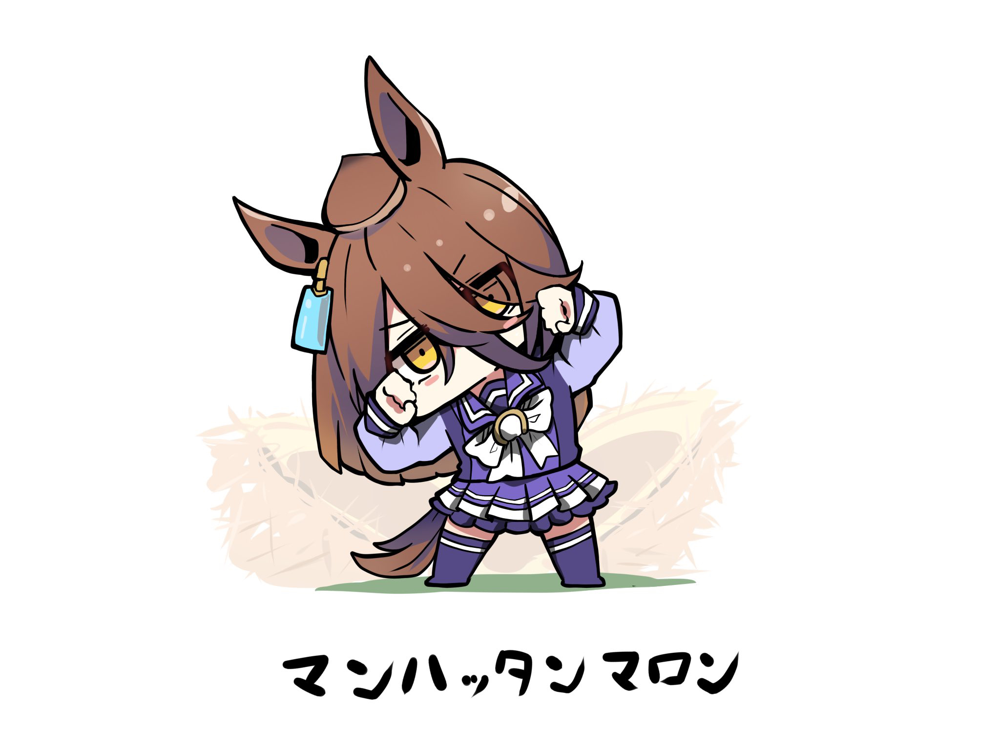 1girlalternate hair coloranimal earsblush stickersbowbrown eyesbrown hairchestnutchibieyes visible through hairfull bodyhair over one eyehands uphorse earshorse girlhorse tailleaning to the sidelong hairlong sleevesno shoespleated skirtpuffy long sleevespuffy sleevespurple shirtpurple skirtpurple thighhighsschool uniformshirtsimple backgroundskirtsolostandingtailthighhighstracen school uniformvery long hairwhite backgroundwhite bow