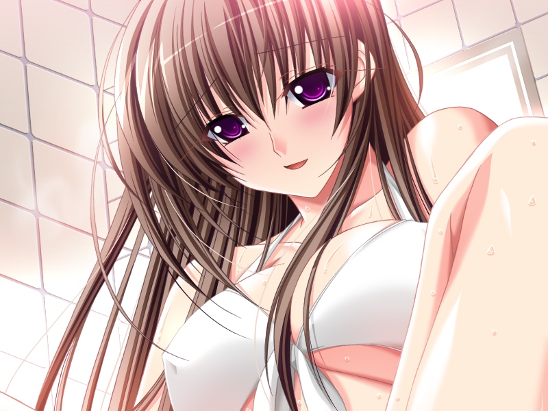 00s1girlbathroomblushbreastsbrown hairfemale focuslarge breastslong hairpurple eyessmilesolosteamsweattilesunderboob