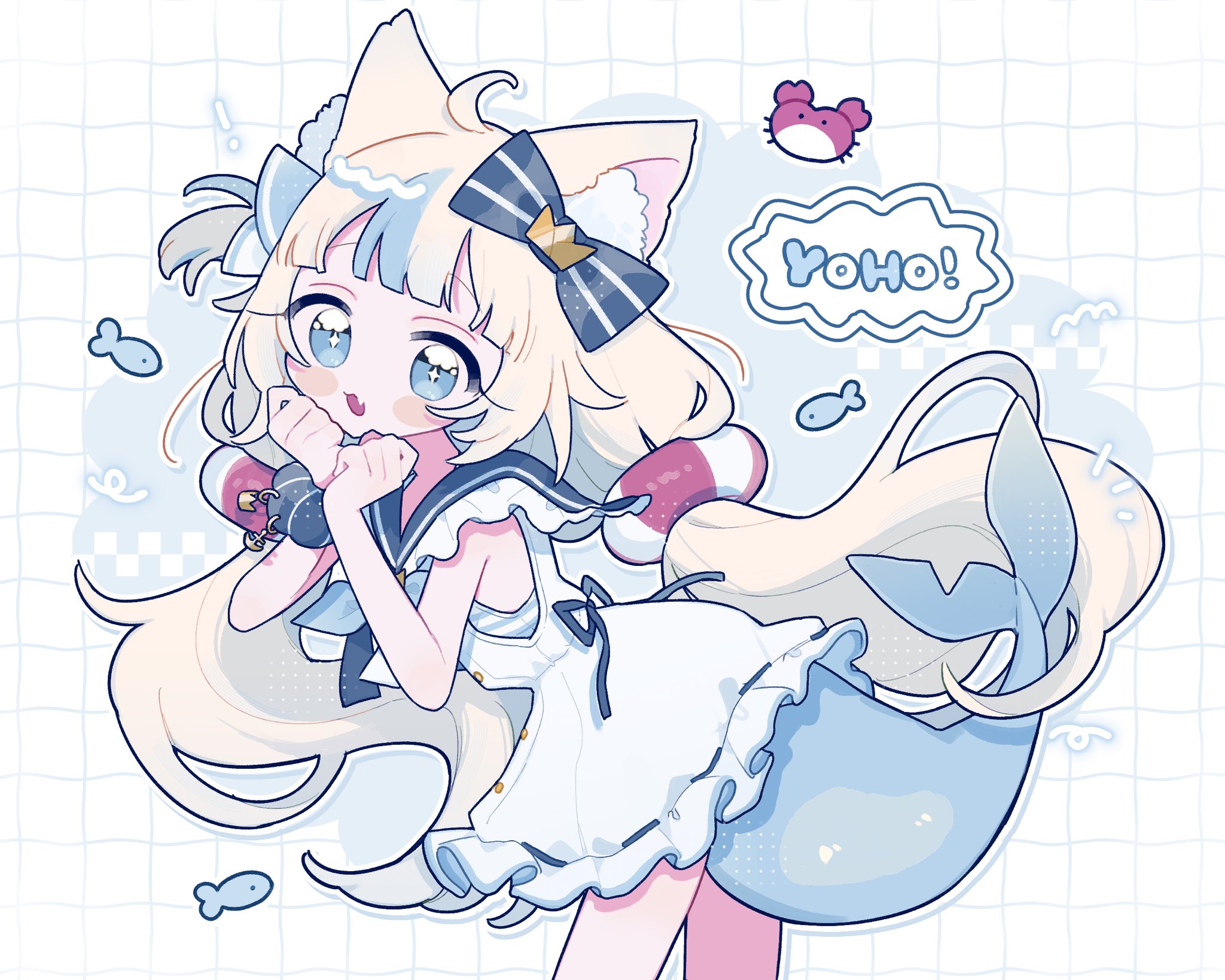 :3ahogeanimal ear fluffanimal earsblonde hairblue eyesblue sailor collarblue streakscat earsdressenglish textfangfinsfish girlfish tailfrom sidelifebuoy hair ornamentlong hairlow twintailsmulticolored hairone side upsailor collarsailor dressscrunchieskin fangsleevelesssleeveless dresssparkling eyesstreaked hairtailtwintailsvirtual youtuberwrist scrunchie
