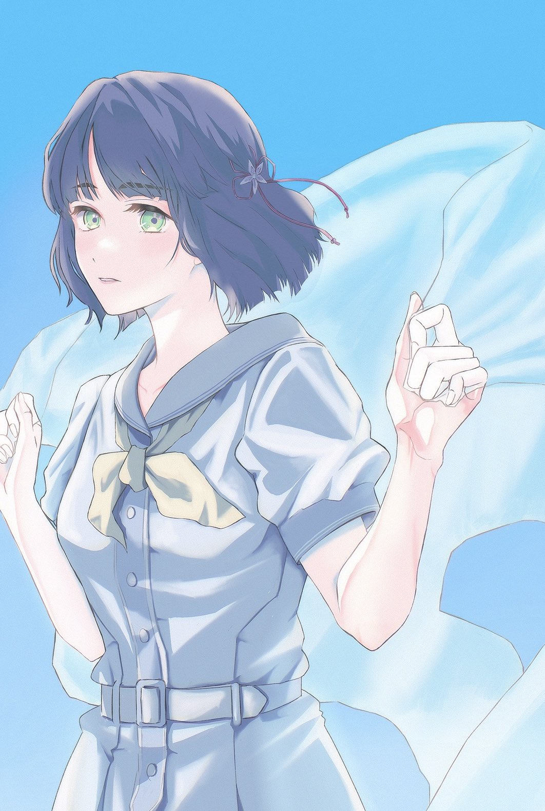 1girlblack hairblue backgroundblunt bangsblunt endsbob cutcowboy shotdressflowerflower knotgreen eyeshair flowerhair ornamenthasu no sora school uniformlooking at viewerneckerchiefparted lipspleated dresssailor collarsailor dressschool uniformshort hairshort sleevessimple backgroundsolosummer uniformvirtual youtuberwhite dresswhite flowerwhite sailor collaryellow neckerchief
