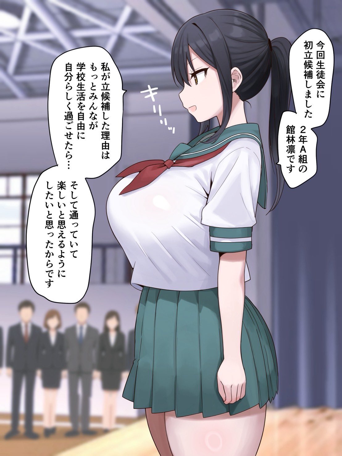 black hairbreastsfrom sidelarge breastsnapeneckerchiefponytailred neckerchiefschool uniformsmilethighs