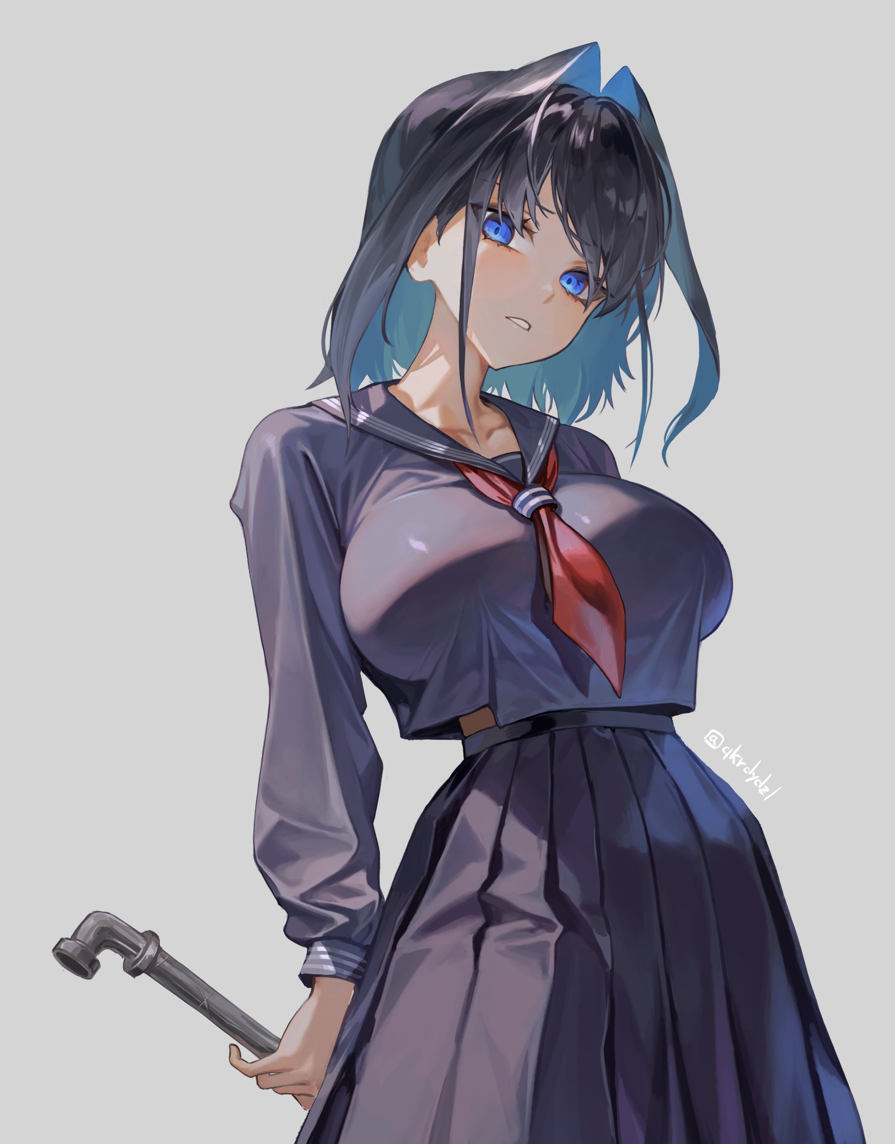 1girlblack hairblue eyesblue hairblue sailor collarblue serafukublue skirtbreastscolored inner haircosplayfanged bangsgrey backgroundhair intakesholdingholding lead pipelarge breastslead pipelooking at viewermulticolored hairneckerchiefparted lipspleated skirtred neckerchiefsailor collarschool uniformserafukushimizu hinako (cosplay)short hairsimple backgroundskirtsolovirtual youtuber