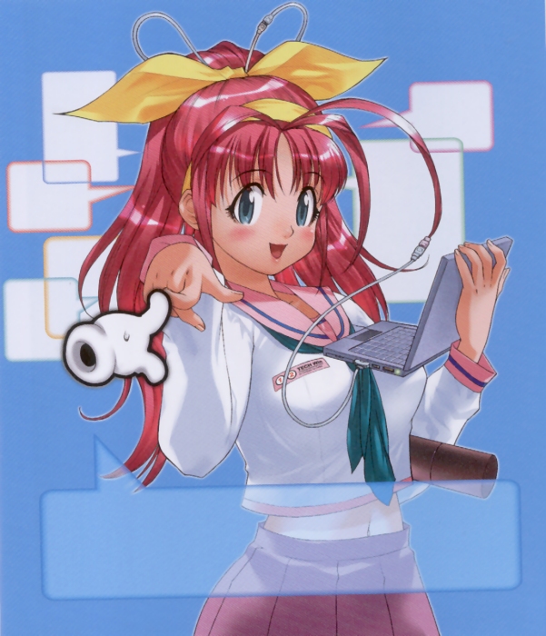 1girlcomputercursorcyborgdisembodied handfemale focusgrabber toollaptoppointingpokingred hairschool uniformserafukusolospeech bubble