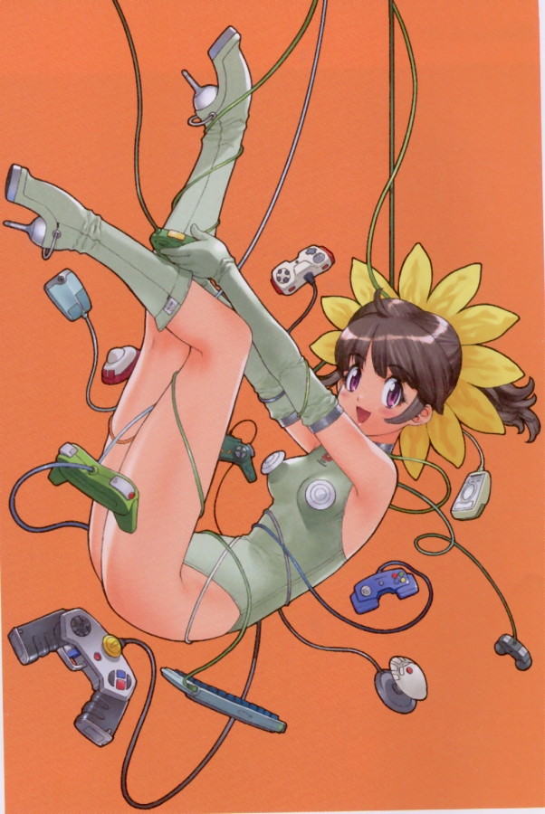 1girlbootsbrown haircomputercontrollerfallingfemale focusgame controllergreen bootshair ornamenthigh heelslegsleotardlong hairlooking at viewerponytailshoessmilesolowire