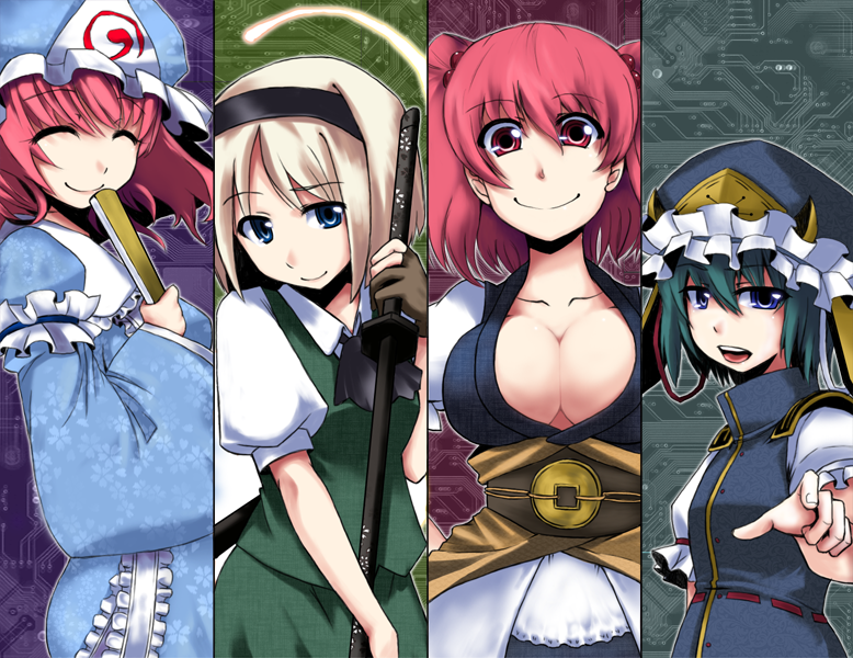 4girlsbreastscleavagecolumn lineupfemale focusfolded fanfolding fanhand fankatanalarge breastsmultiple girlspointingsmileswordweapon