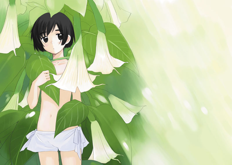 1girlandrogynousblack eyesblack haircensoredcollarboneconvenient censoringexpressionlessfemale focusflat chestflowerfreckleslily (flower)short hairshortssolostandingtopless female