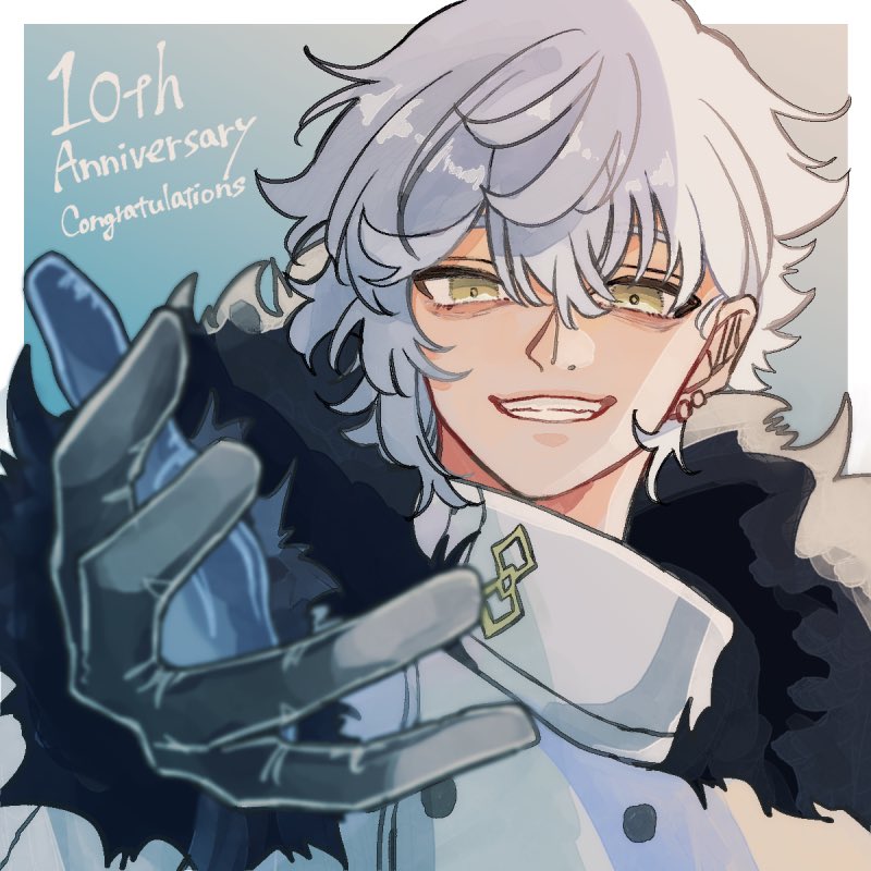 1boyanniversarybags under eyesblue backgroundborderbuttonschaldea logocoatdouble-breastedearringsfur trimfur-trimmed coatfur-trimmed sleevesglovesgradient backgroundgrey glovesgrey hairgrinhair between eyeshappy anniversaryjewelrylong sleeveslooking at viewermale focusoutside borderreachingreaching towards viewersimple backgroundsmilesoloupper bodywhite borderwhite coatyellow eyes
